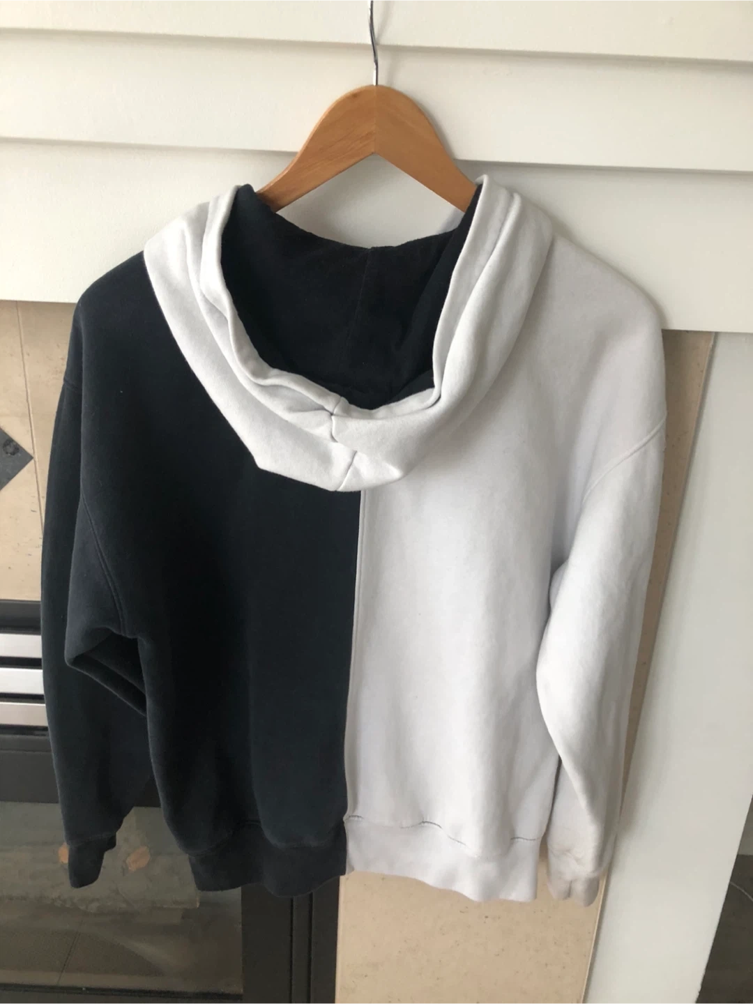 Hollister hoodie with a two-tone black and white design. It's a size medium and features a front pocket. Made from a soft cotton blend. Size m