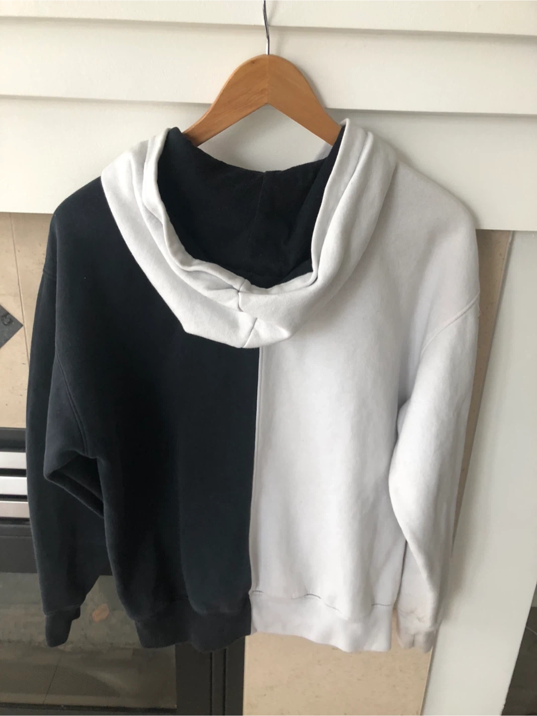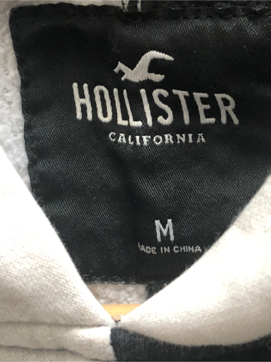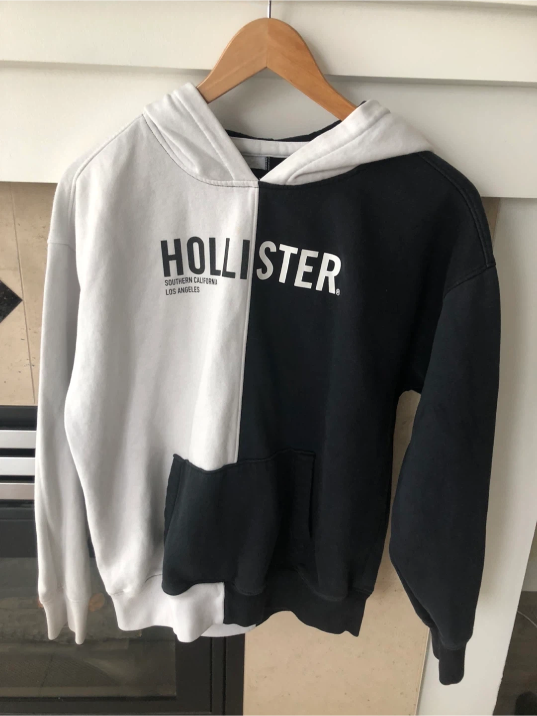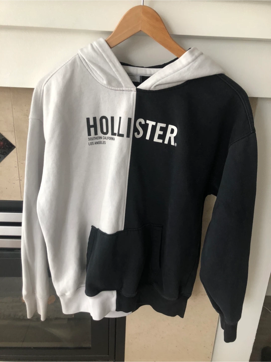 Hollister hoodie with a two-tone black and white design. It's a size medium and features a front pocket. Made from a soft cotton blend. Size m
