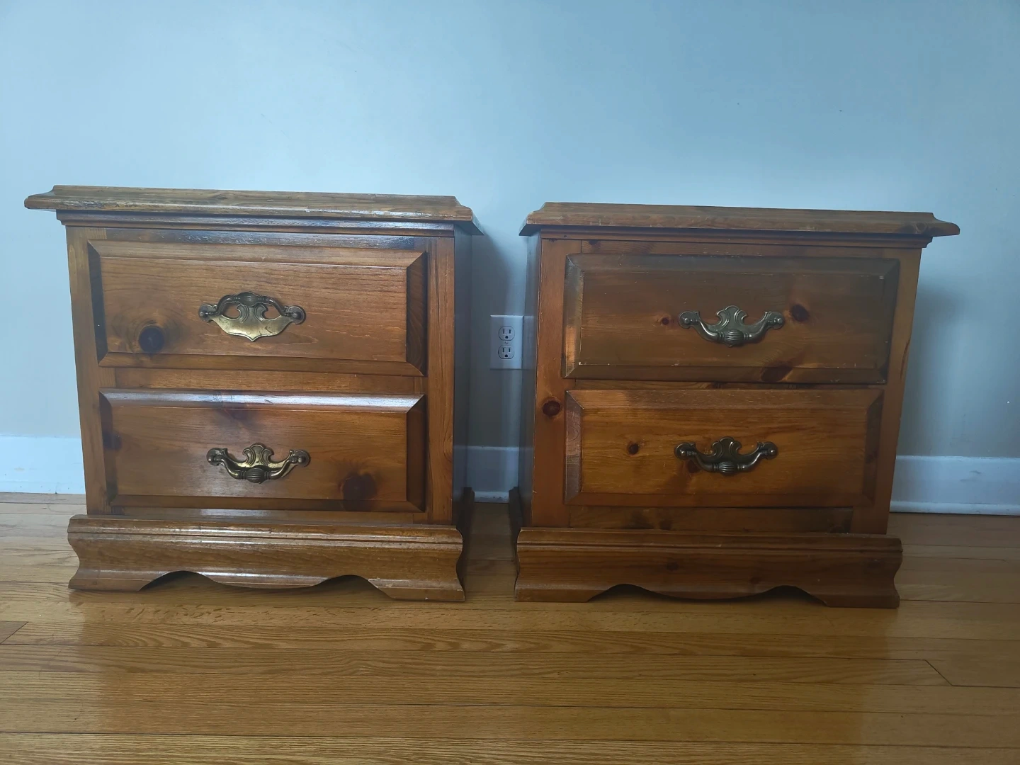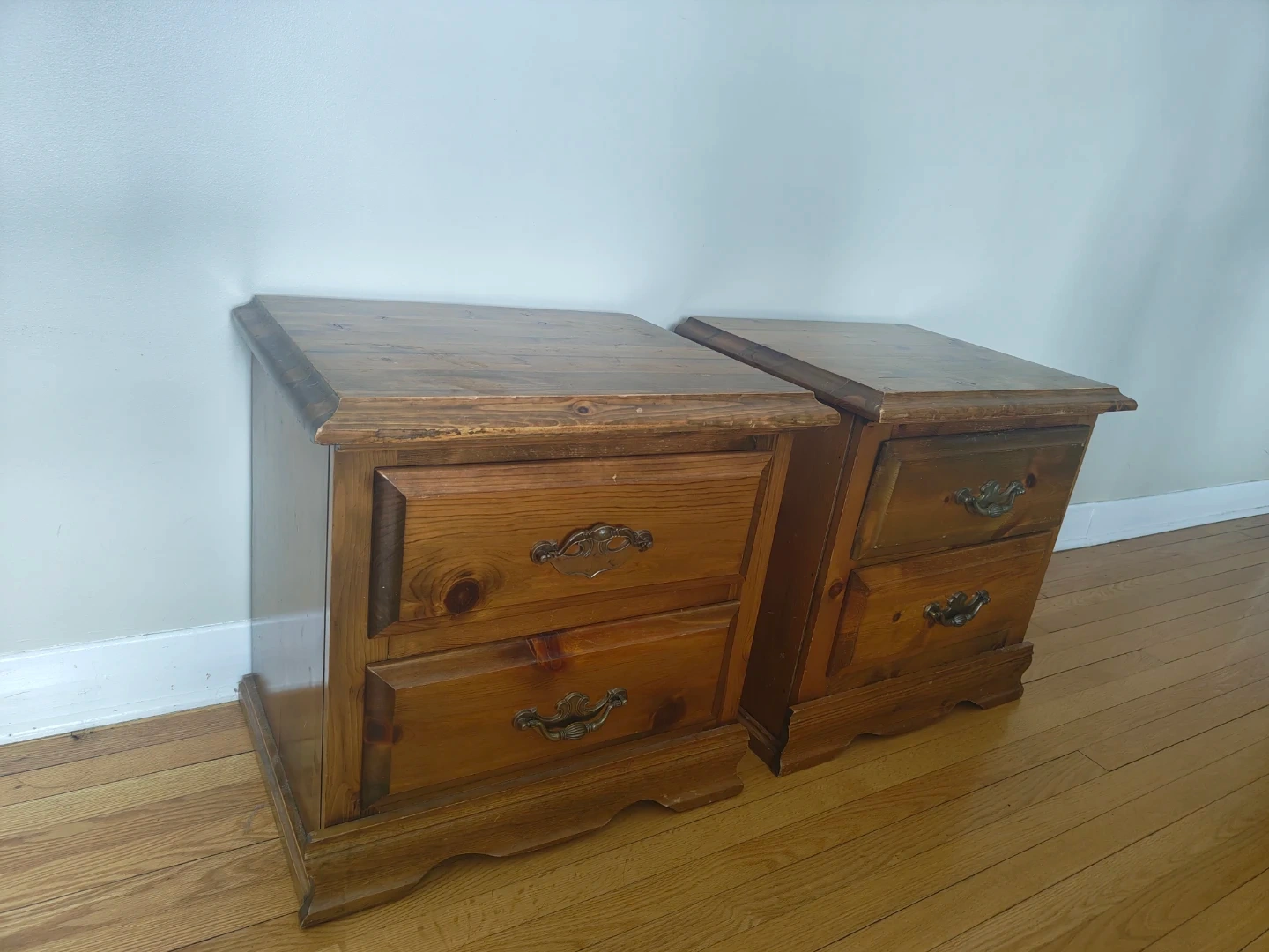 Two wooden nightstands with two drawers each. They feature brass-toned drawer pulls. Good for bedroom storage!