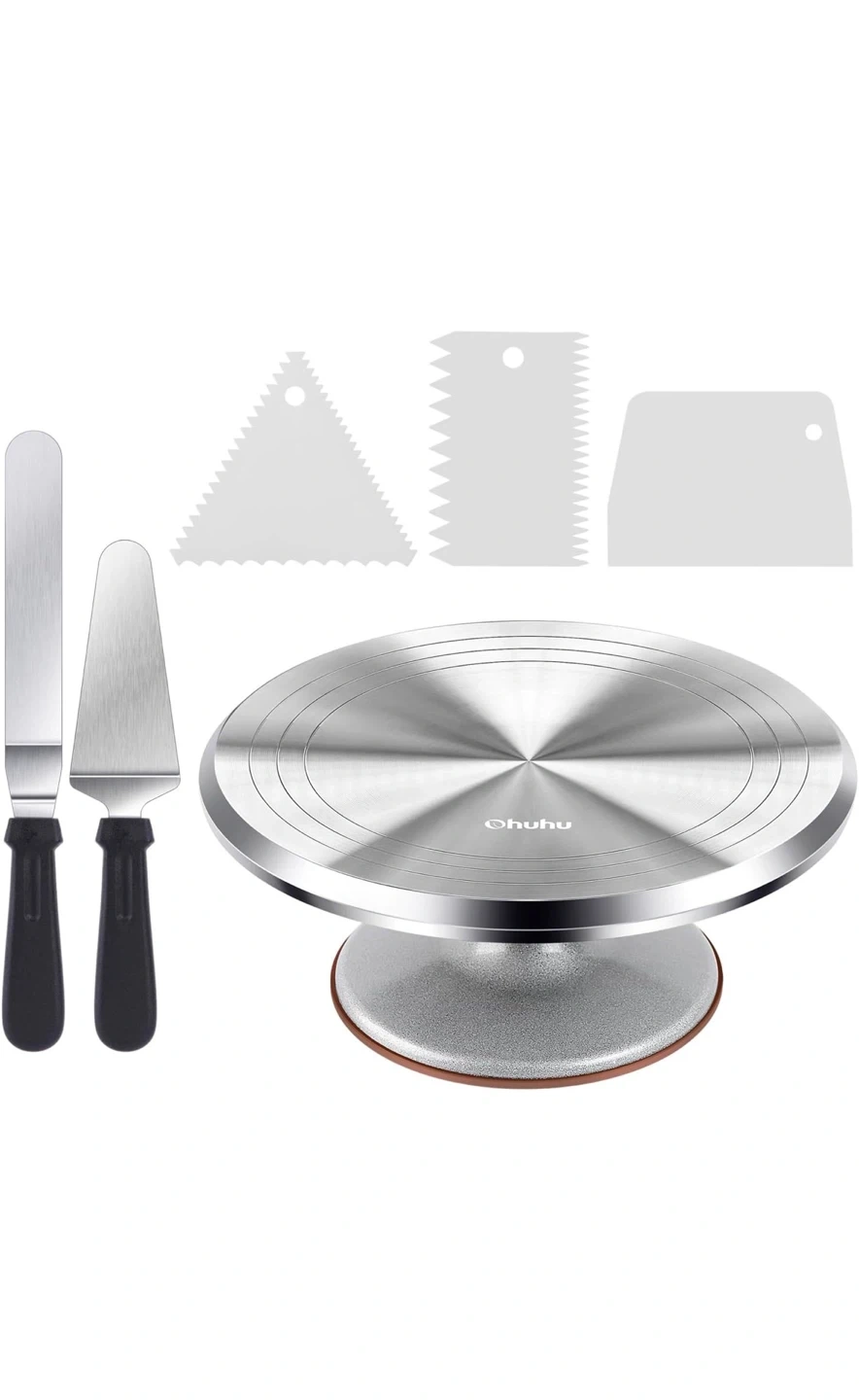 This cake decorating set includes a rotating turntable and three icing spatulas. The turntable is 12.1" in diameter and 3.7" high. Spatulas measure 7.9" and 5.7" long. Perfect for smoothing frosting and creating beautiful cakes!