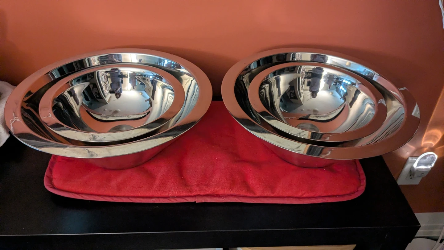 Selling a set of stainless steel mixing bowls. They're in great condition and perfect for all your baking and cooking needs! The set includes various sizes to accommodate different tasks in the kitchen. They are durable and easy to clean!