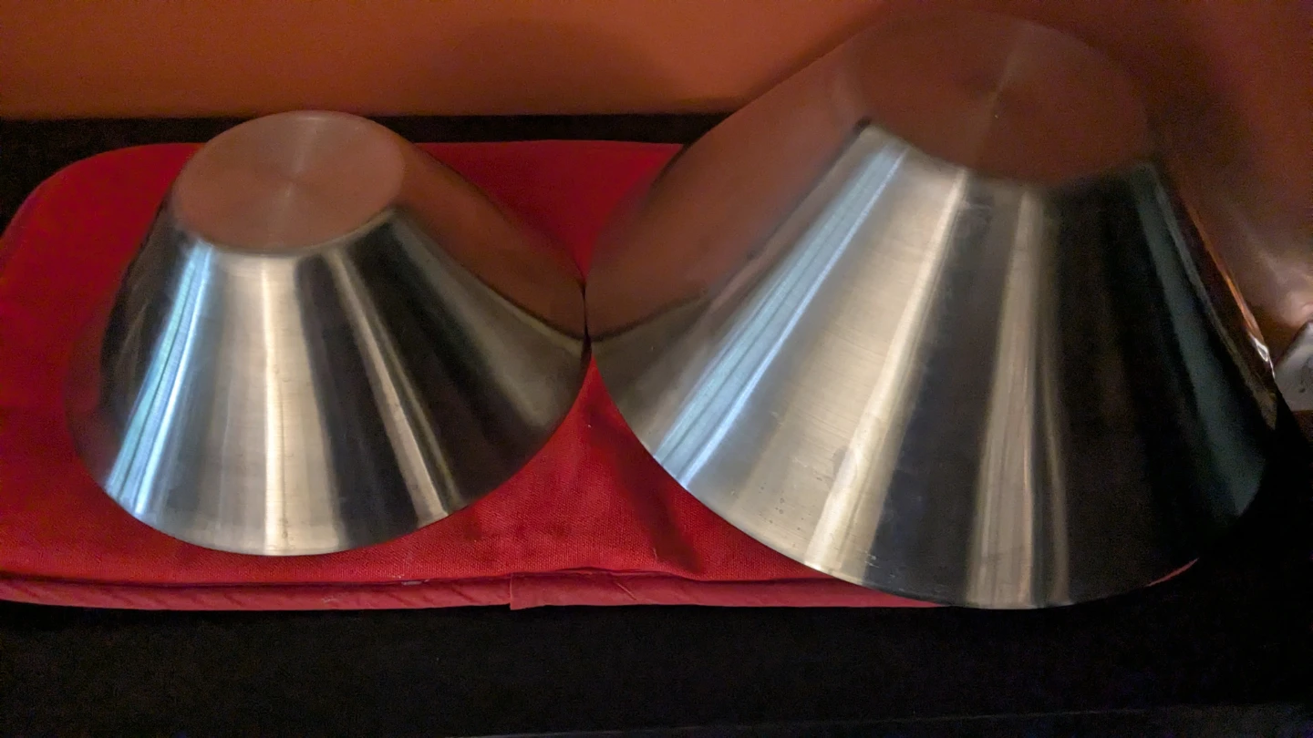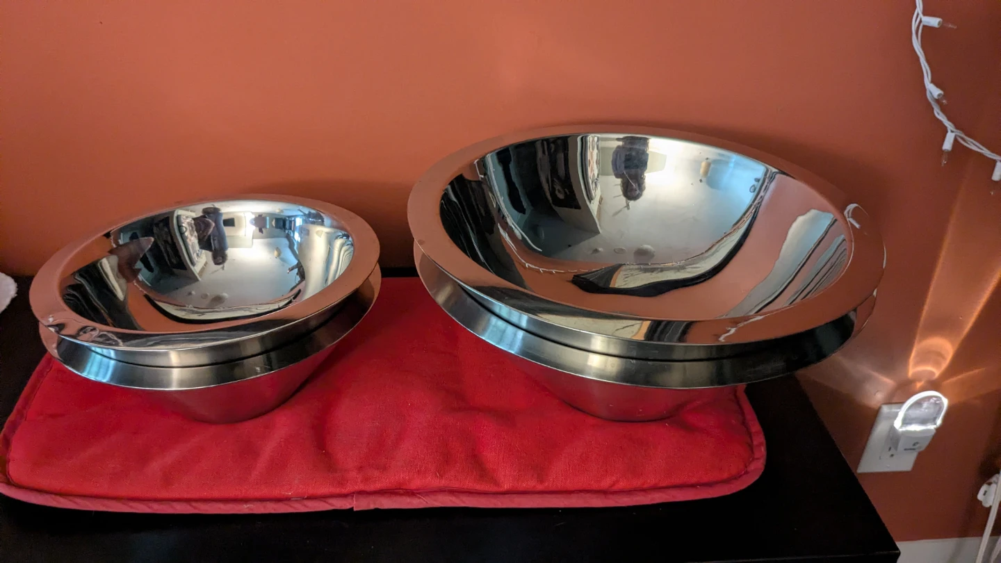 Selling a set of stainless steel mixing bowls. They're in great condition and perfect for all your baking and cooking needs! The set includes various sizes to accommodate different tasks in the kitchen. They are durable and easy to clean!