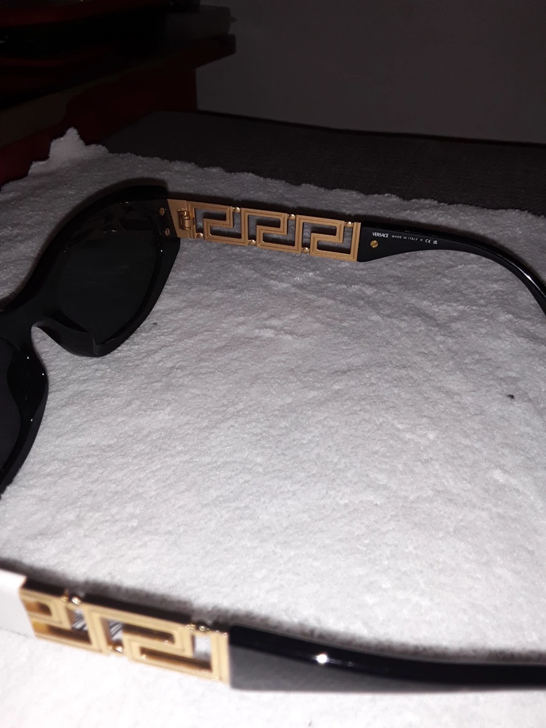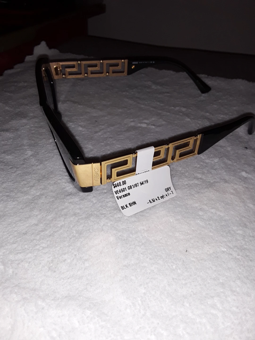 These are Versace VE4501 sunglasses in black with gold detailing. They have a 54/19 lens size and grey lenses. Made in Italy.