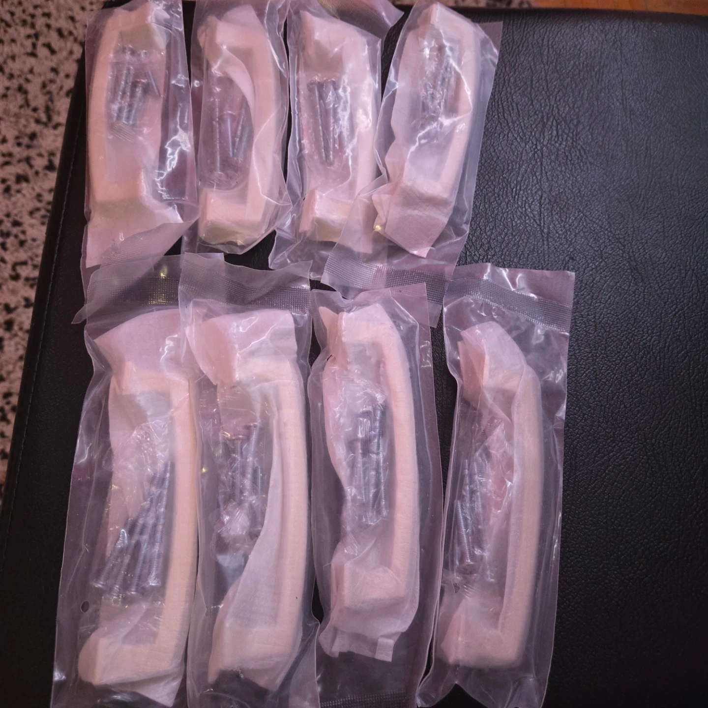 Selling a set of eight cabinet door handles, still sealed in their original packaging! Each handle comes with its own set of screws for easy installation. They appear to be a light, neutral colour that would suit many styles of cabinetry
