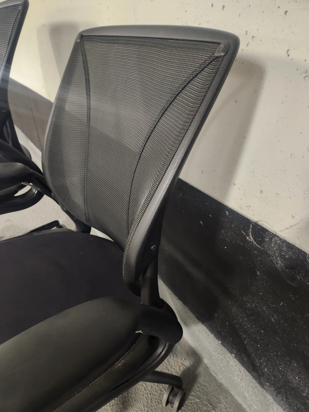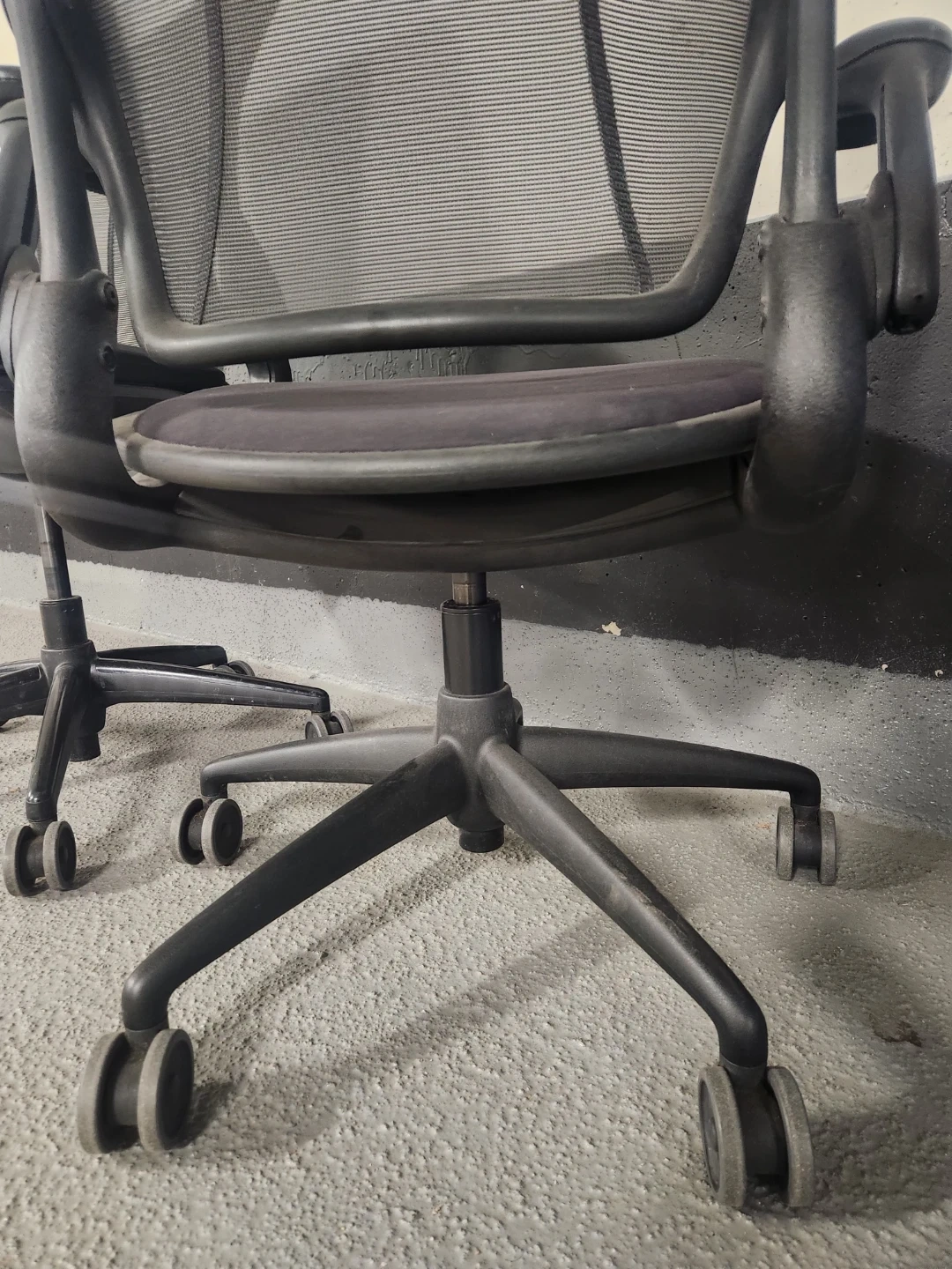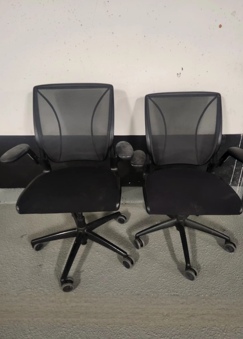 Two black mesh back ergonomic office chairs. These chairs offer adjustable armrests and a comfortable seat. They're great for any home or office. Retails for $1800 new, asking only $350 each or take both for $600.