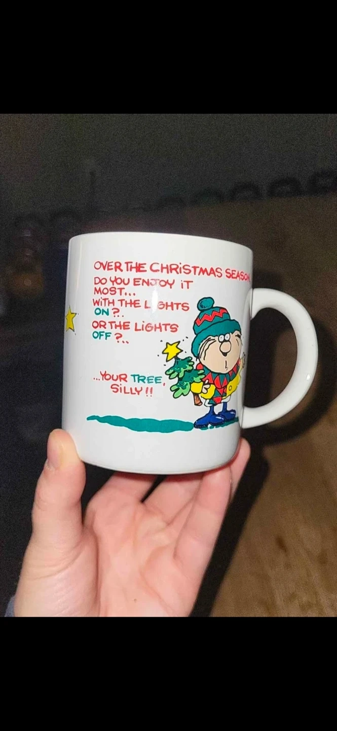 White ceramic mug with a humorous Christmas graphic and text. It reads 'Over the Christmas Season Do You Enjoy It Most... With The Lights On?.. Or The Lights Off?.. ...Your Tree, Silly!!'. This mug is a fun addition to holiday celebrations. It's perfect for enjoying your morning coffee or tea during the festive season!