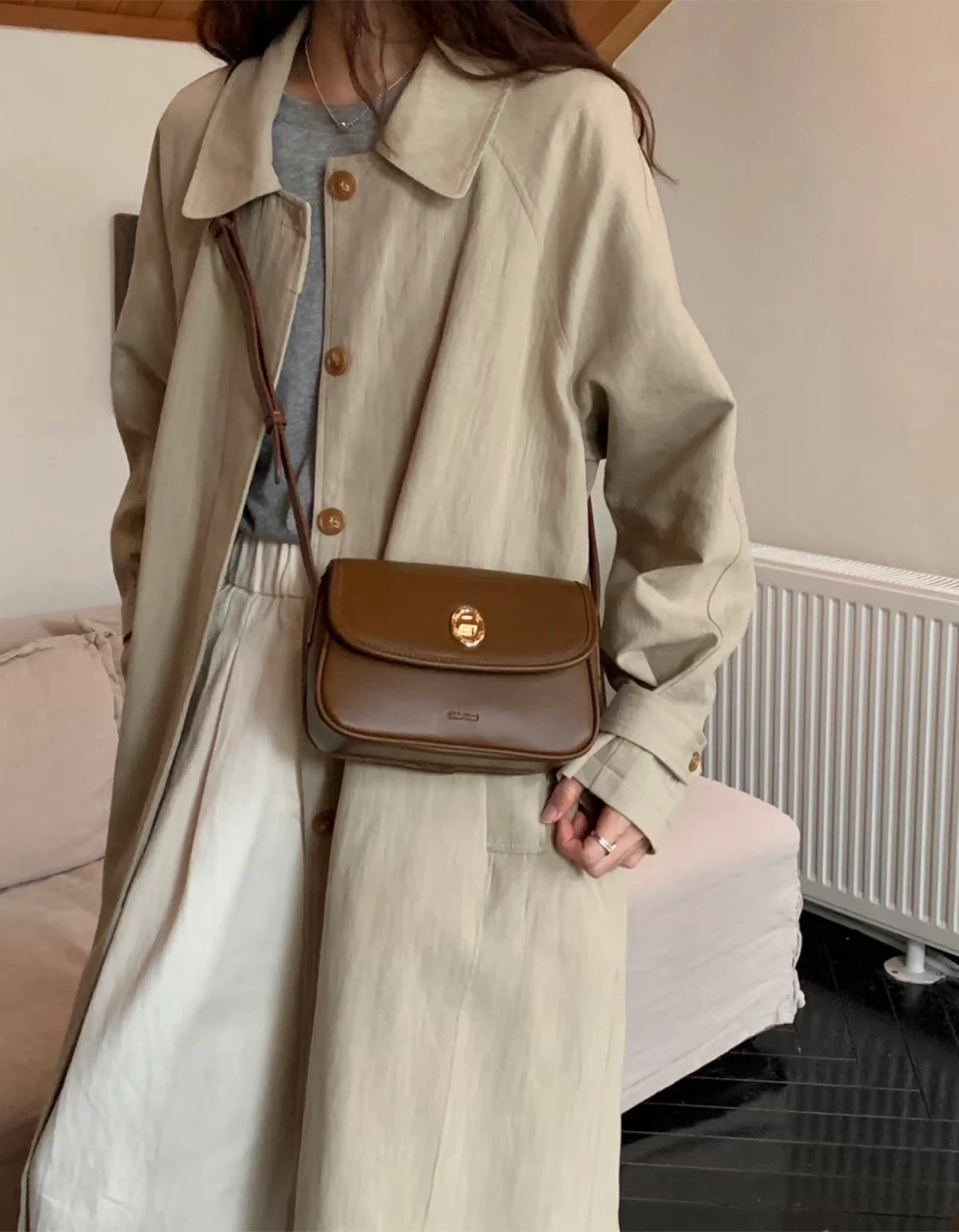 Classic brown crossbody bag with a gold clasp closure. It's made from faux leather and includes an adjustable strap. Perfect for everyday use!