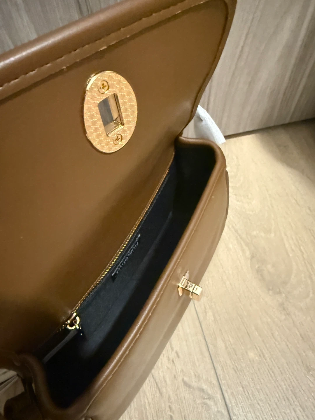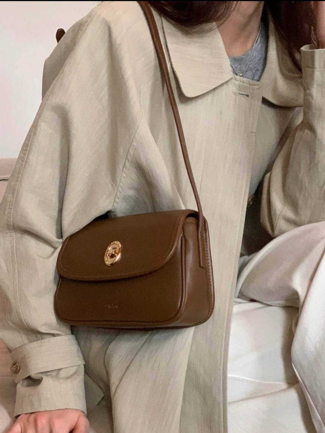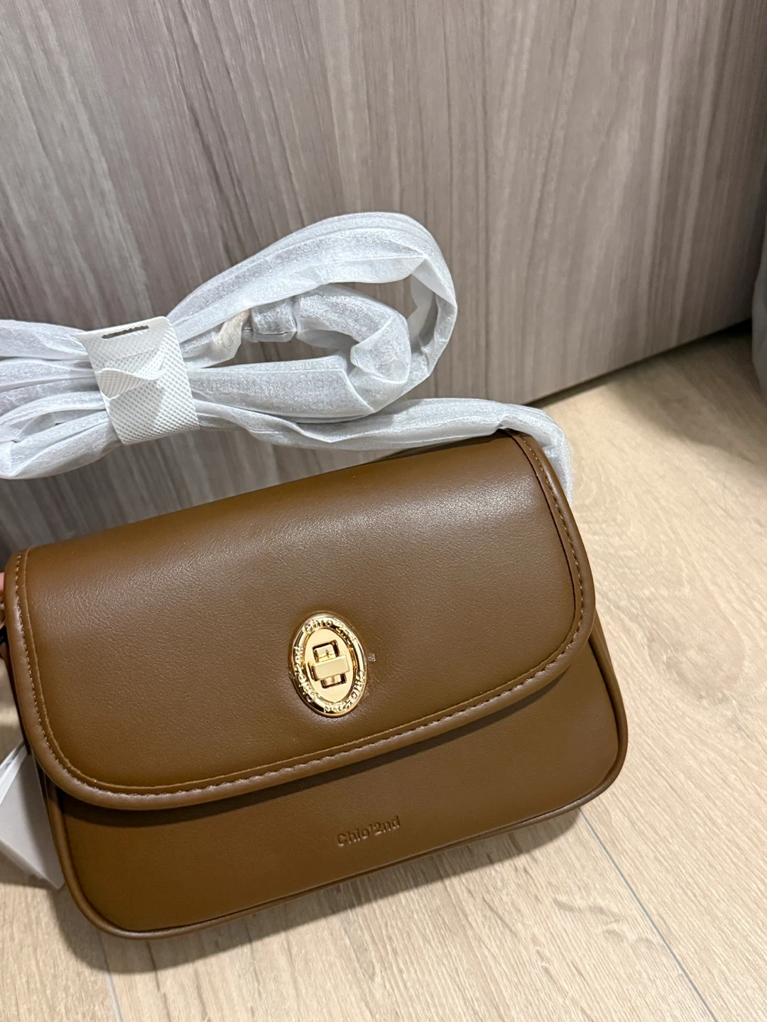 Classic brown crossbody bag with a gold clasp closure. It's made from faux leather and includes an adjustable strap. Perfect for everyday use!