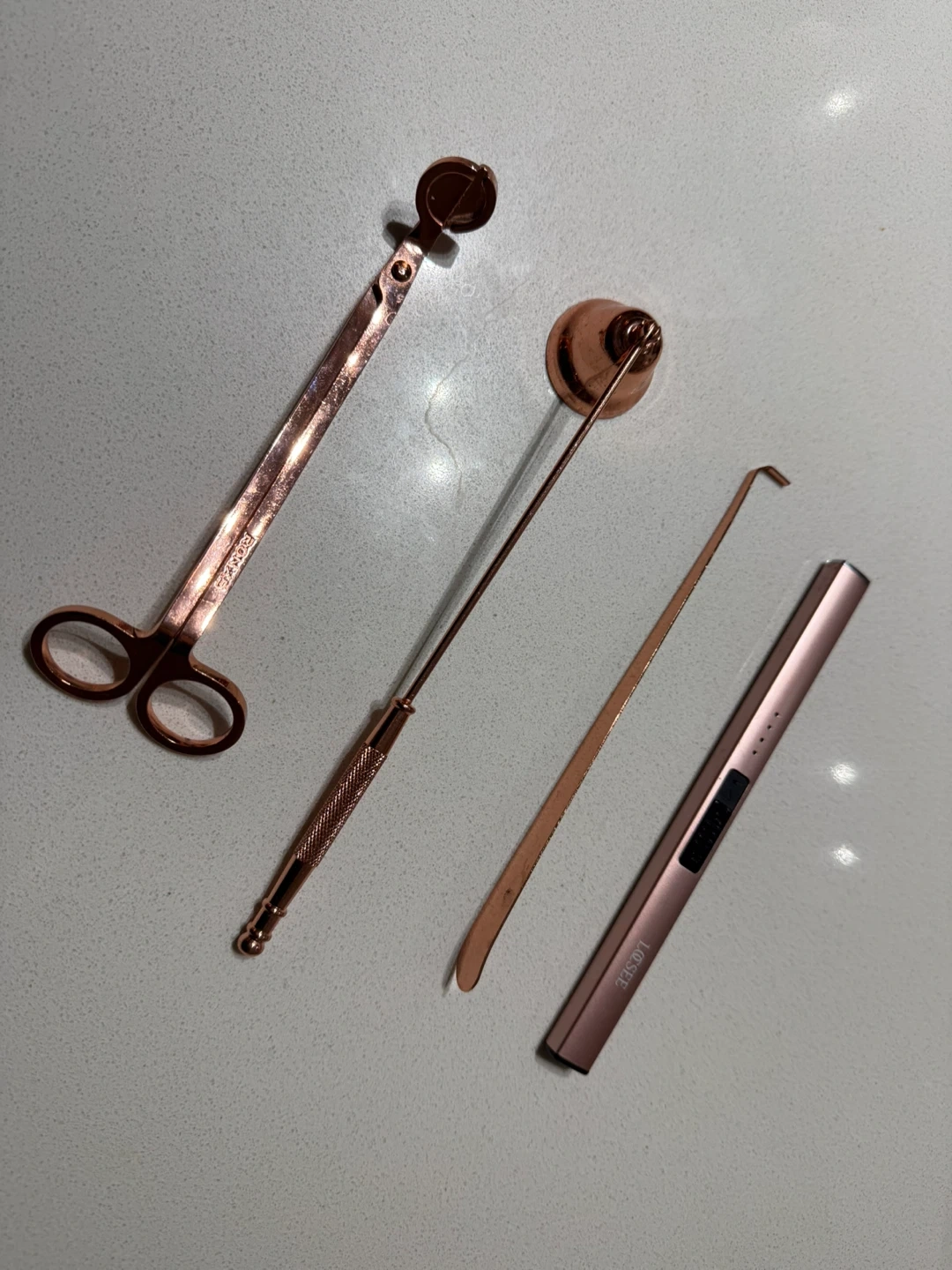 Includes a wick trimmer, snuffer, and scoop, all in a rose gold finish. Also comes with a rose gold USB rechargeable lighter. These tools help maintain your candles for a cleaner burn. It's useful for anyone who enjoys candles!