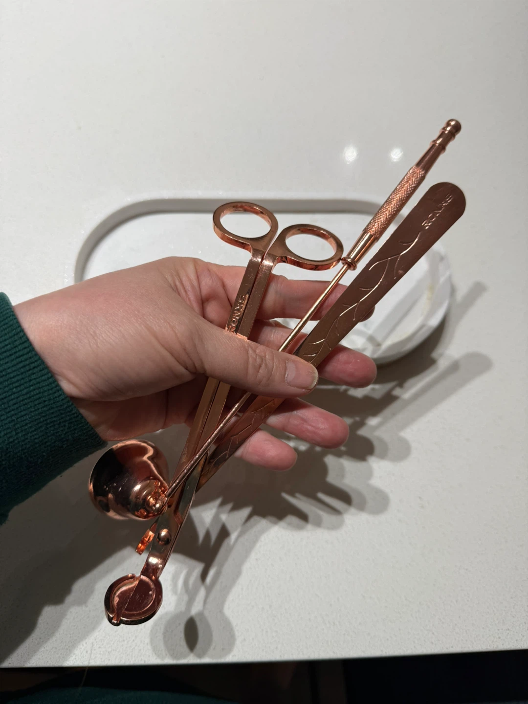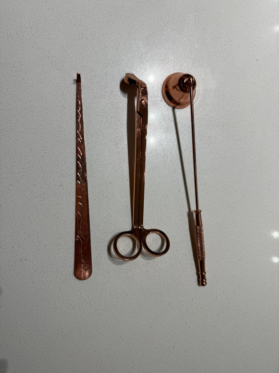 Includes a wick trimmer, snuffer, and scoop, all in a rose gold finish. Also comes with a rose gold USB rechargeable lighter. These tools help maintain your candles for a cleaner burn. It's useful for anyone who enjoys candles!