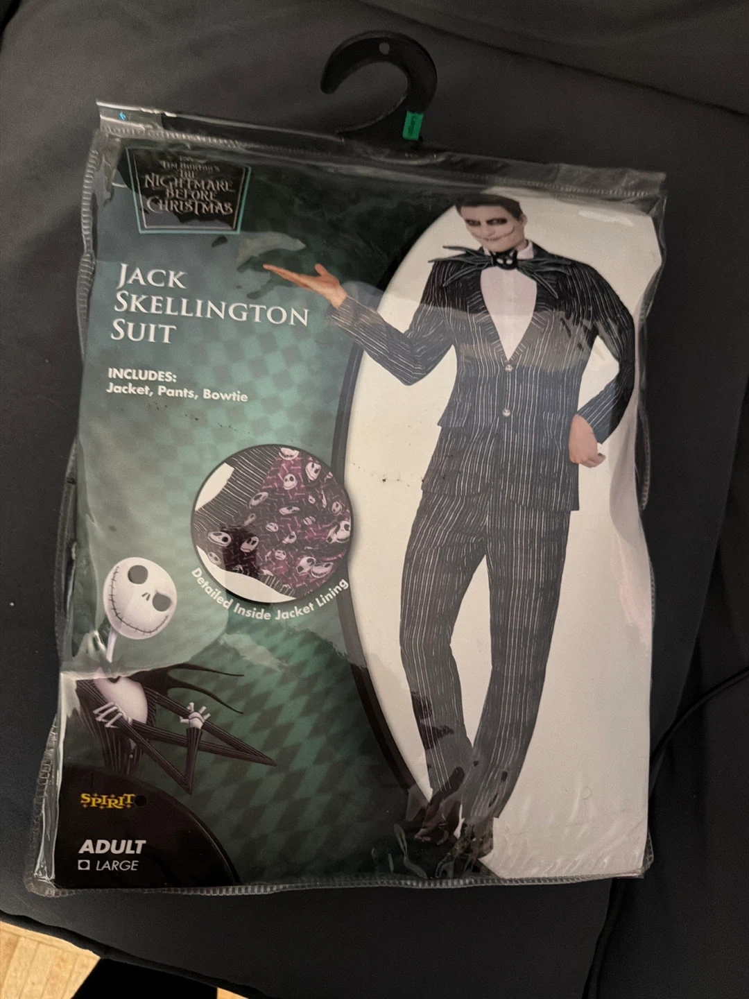 Spirit Halloween Jack Skellington suit for adults. Includes jacket, pants, and bowtie. Features a detailed inside jacket lining with a Halloween pattern. Size is adult large. Used once