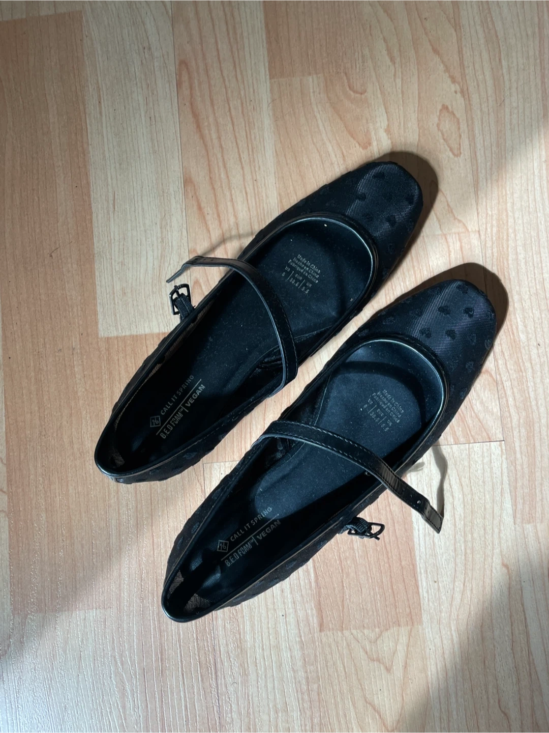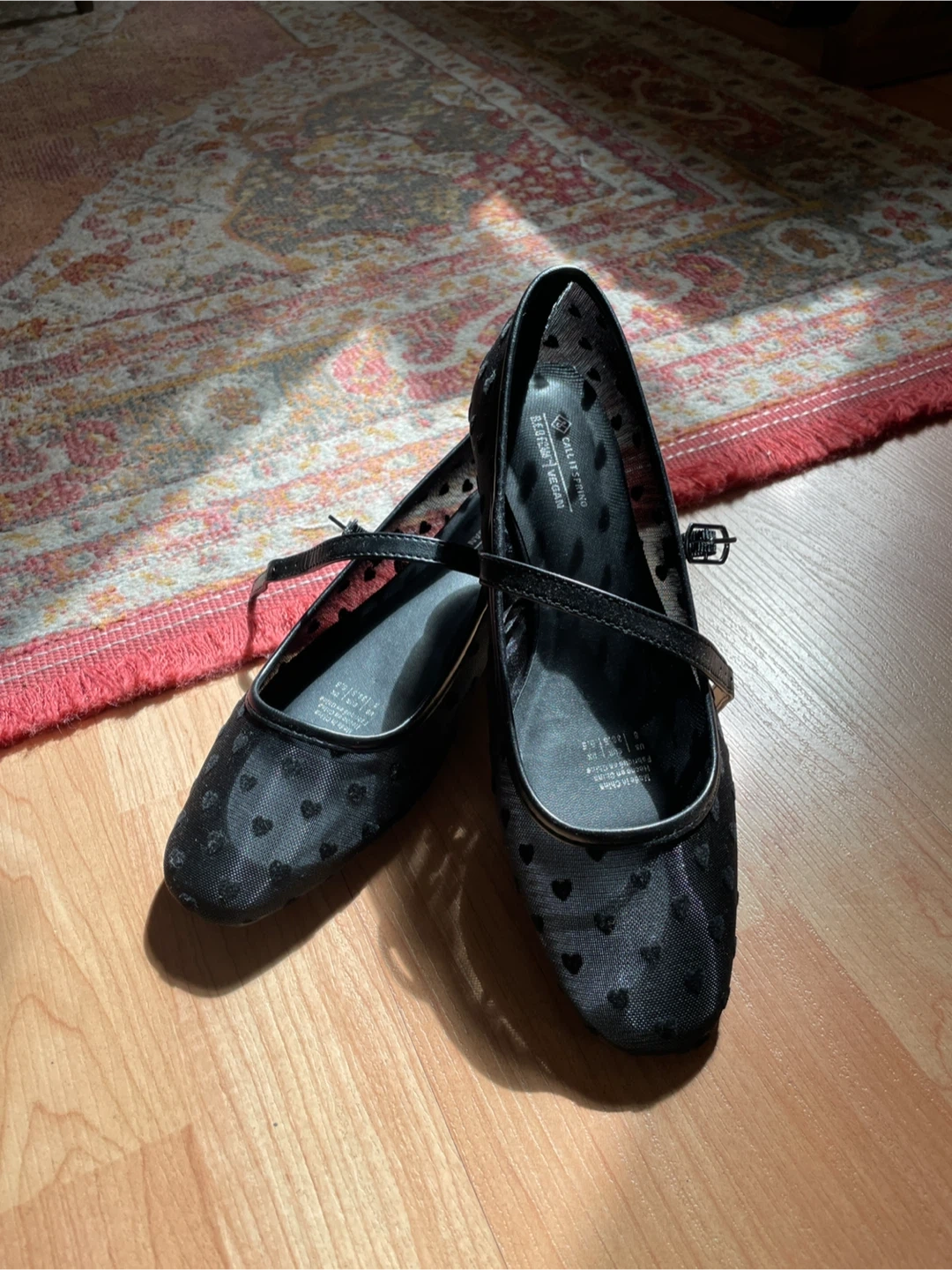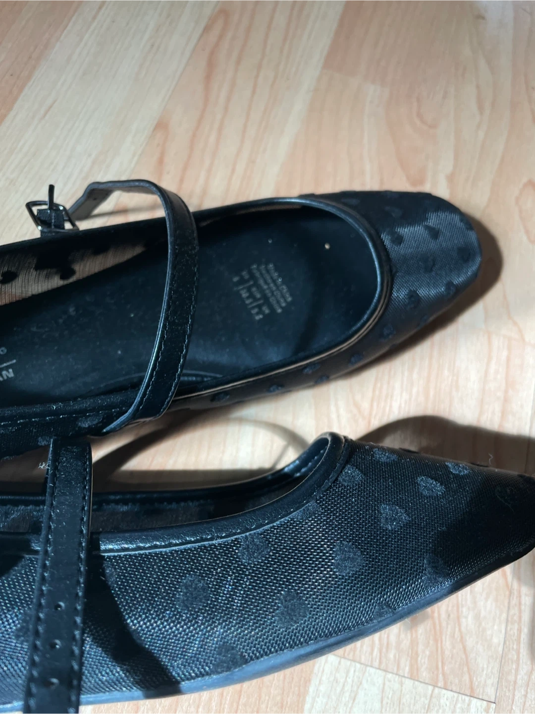 Black mesh flats with a subtle heart pattern. Features a classic Mary Jane strap with buckle closure. Never worn.
