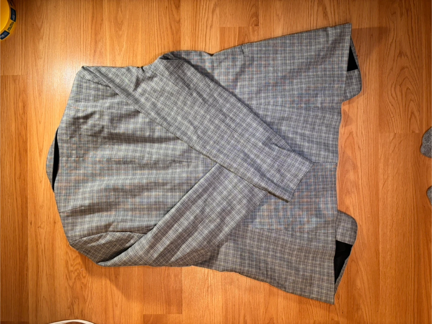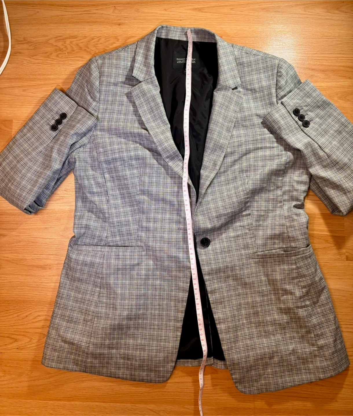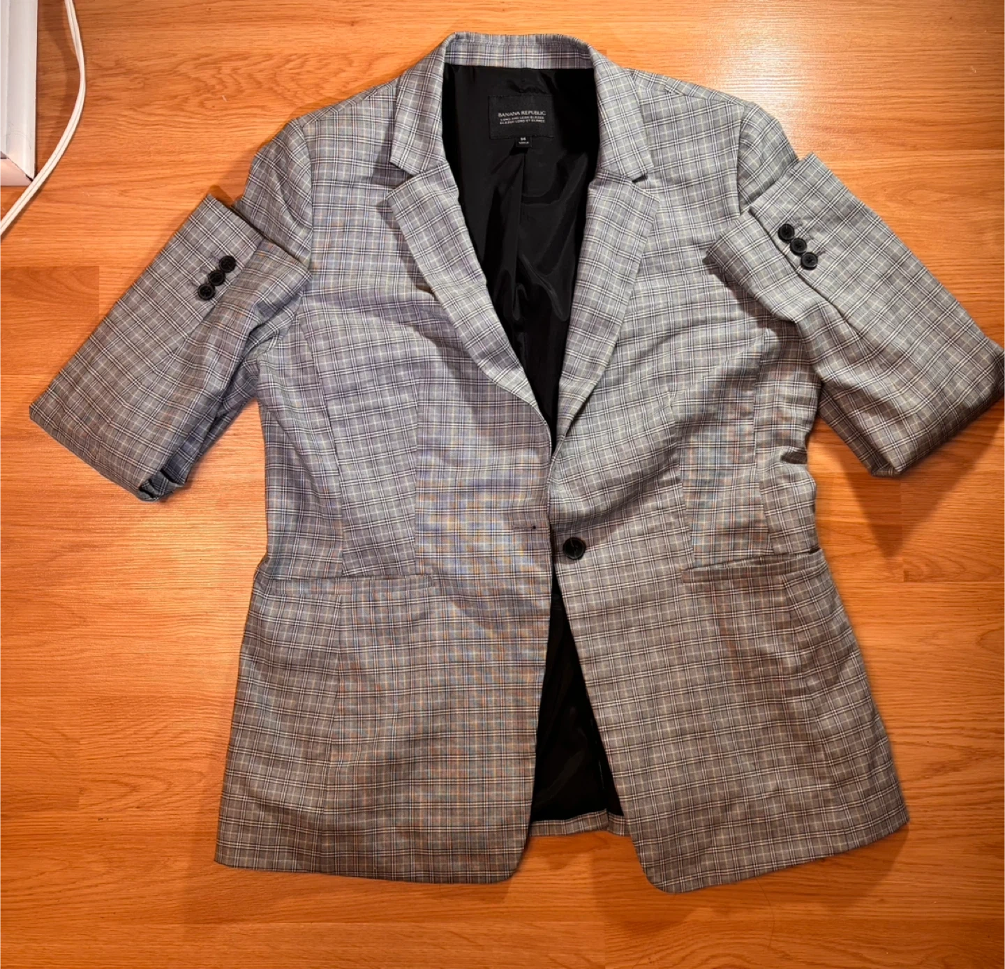 Banana Republic Long and Lean Blazer in a grey plaid pattern. It's a size 14 and made in Jordan. The jacket has a black lining and two front pockets. Button closure at the front.