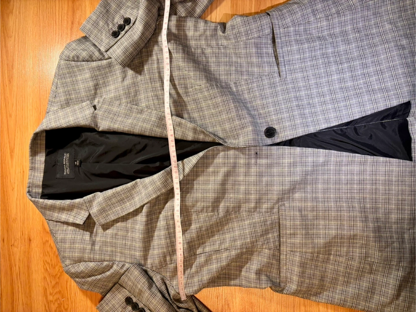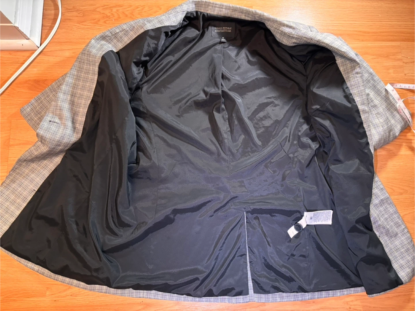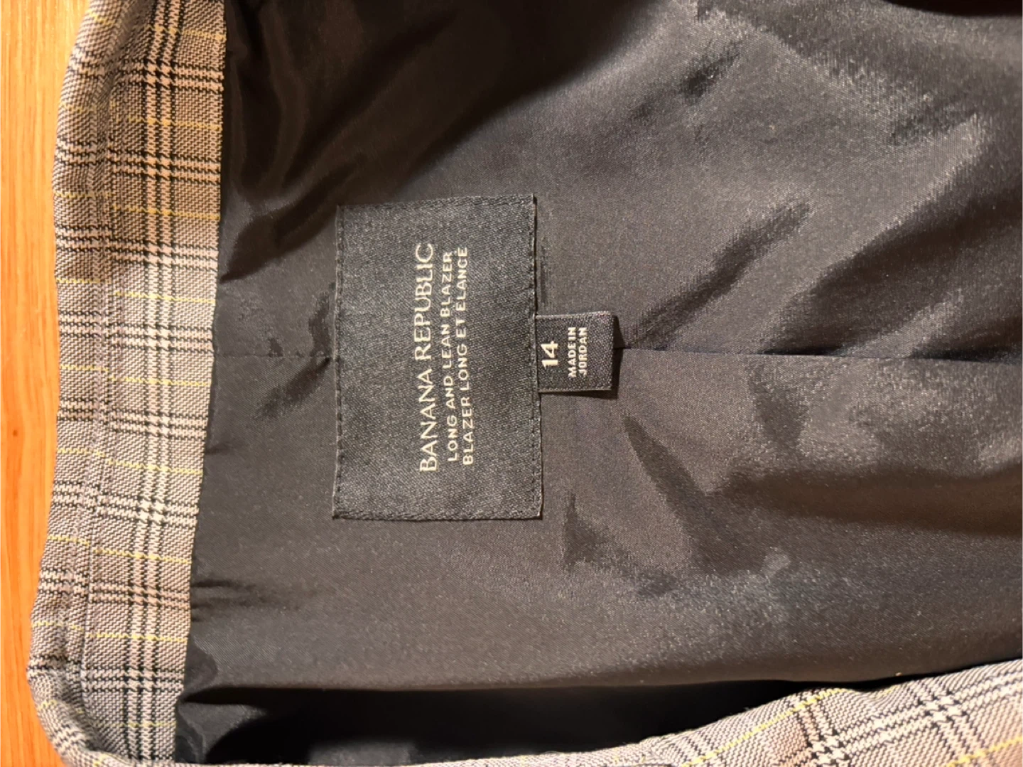 Banana Republic Long and Lean Blazer in a grey plaid pattern. It's a size 14 and made in Jordan. The jacket has a black lining and two front pockets. Button closure at the front.