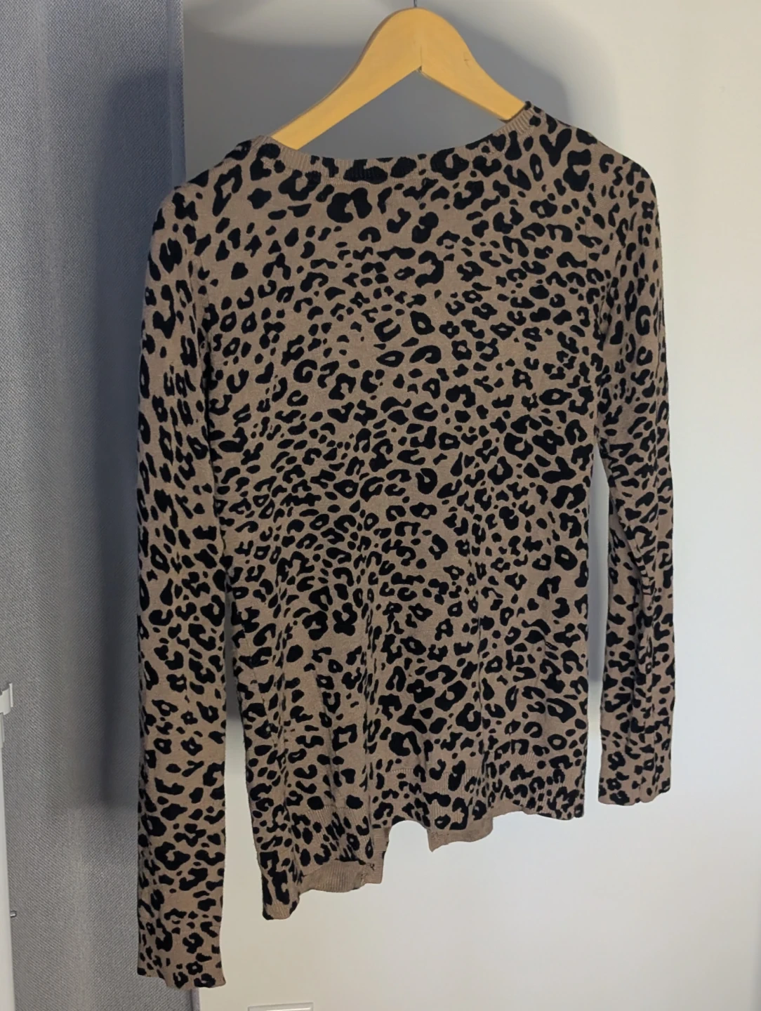 This Dynamite cardigan features a classic leopard print. It's made with 80% rayon and 20% nylon. This is a P/S size.