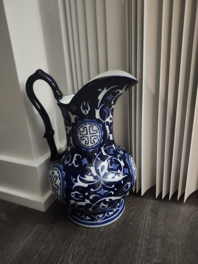 A beautiful decorative pitcher in a classic blue and white pattern! It would look great as a centrepiece or on a shelf