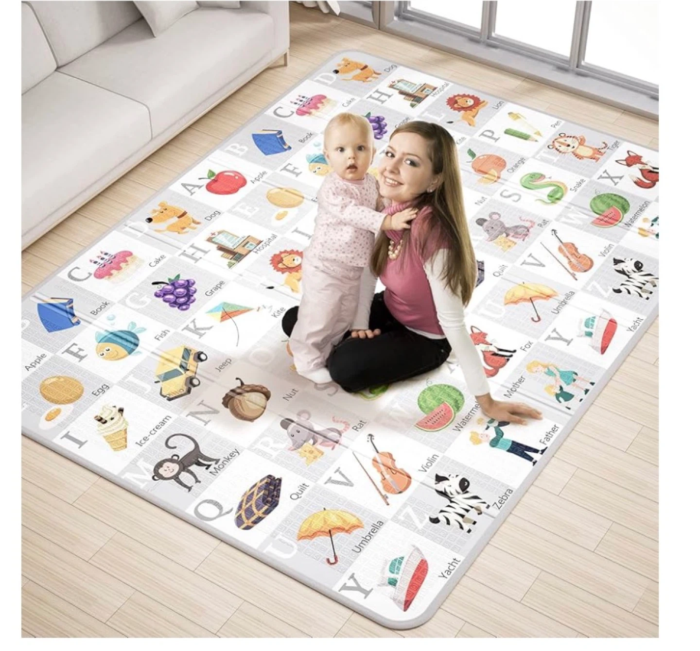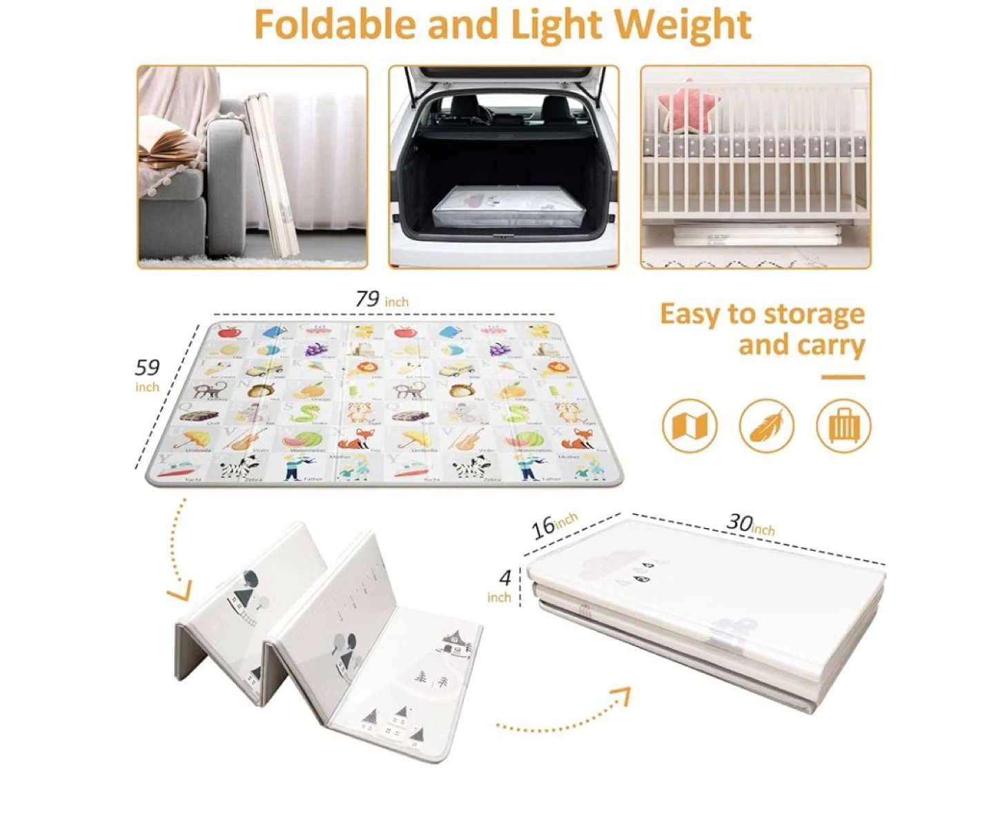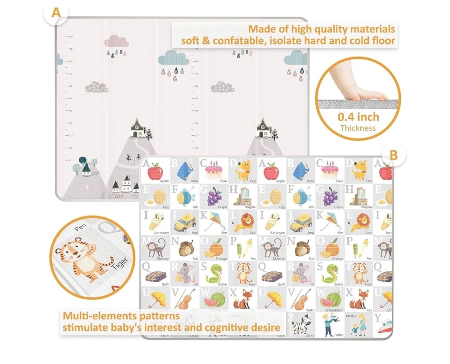 This play mat features an alphabet and multi-element patterns to stimulate baby's interest and cognitive desire. It's made of high-quality materials and is soft, making it isolative from hard and cold floors. It's also foldable and lightweight for easy storage and carrying, with a thickness of 0.4 inches. Suitable for babies and toddlers to learn and play on.