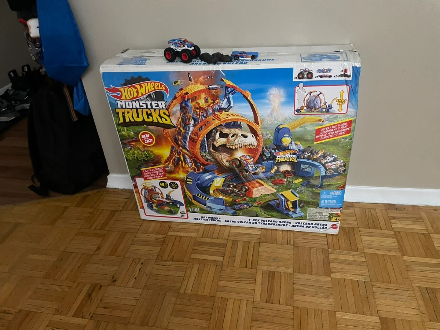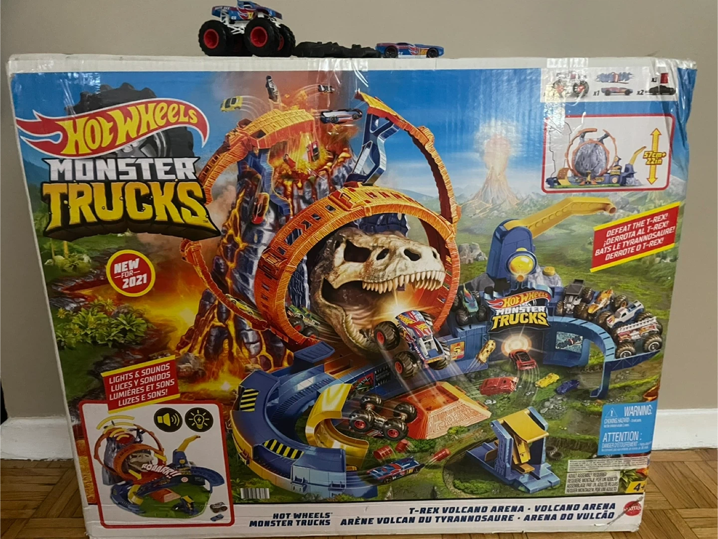 This Hot Wheels Monster Trucks T-Rex Volcano Arena playset is new for 2021. It features lights and sounds! Includes one monster truck and two other vehicles. Dimensions are 57cm x 22in.