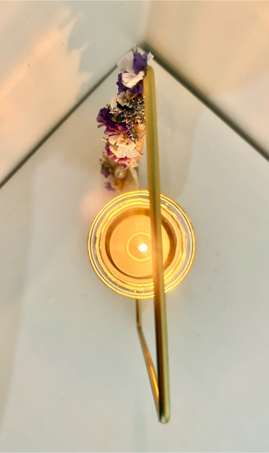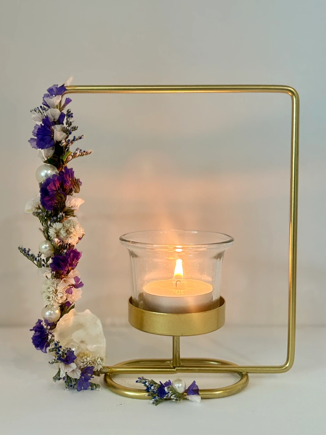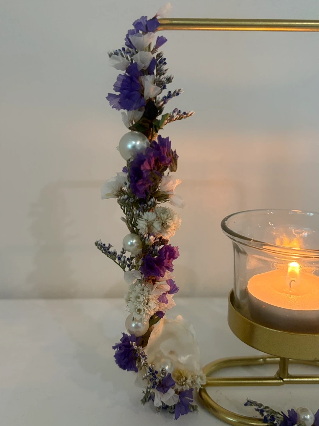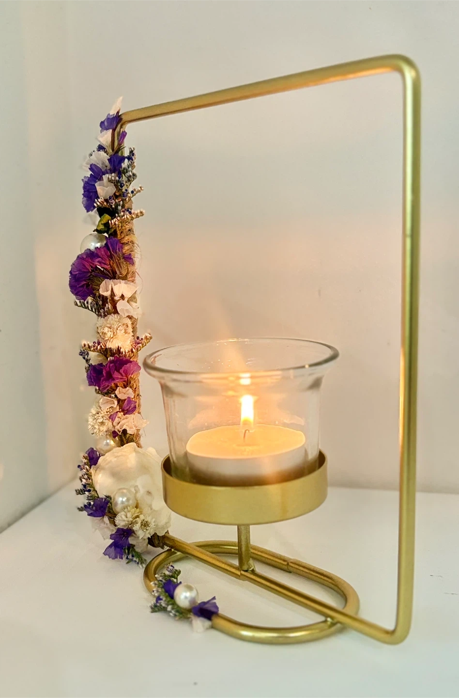 Add a touch of elegance to your space with this beautiful gold candle holder! It features a delicate floral arrangement with pearls, perfect for creating a cozy and inviting atmosphere