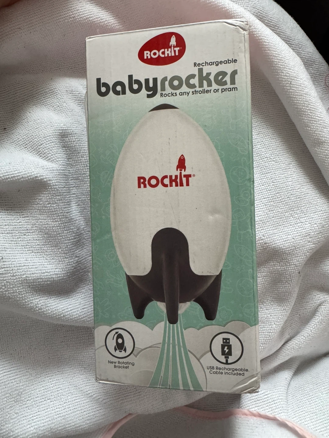 Selling a Rockit baby rocker! This handy gadget attaches to strollers or prams to gently rock your baby. It's showerproof and comes with a rechargeable battery. It also features adjustable speed and a quiet motor. The box includes the Rockit, a universal bracket, a USB charging cable, and instructions