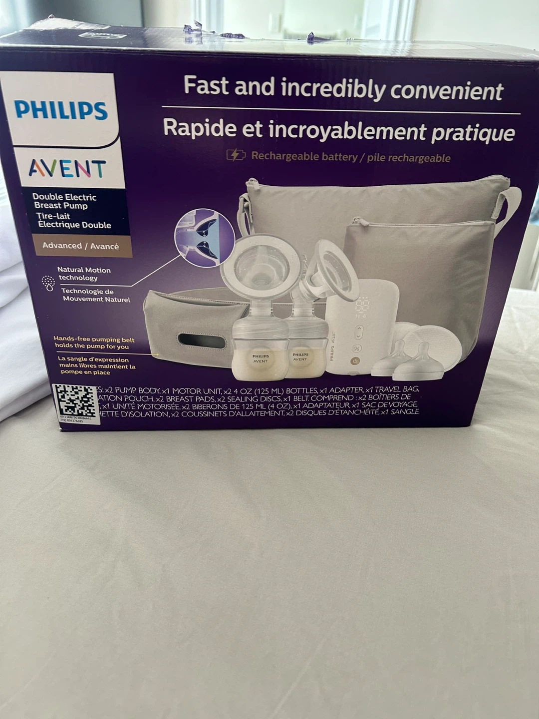 This is the Philips Avent Double Electric Breast Pump in Advanced. It includes two pump bodies, one motor unit, two 4 oz bottles, an adapter, a travel bag, and a hands-free pumping belt. It also comes with two breast pads and two sealing discs.