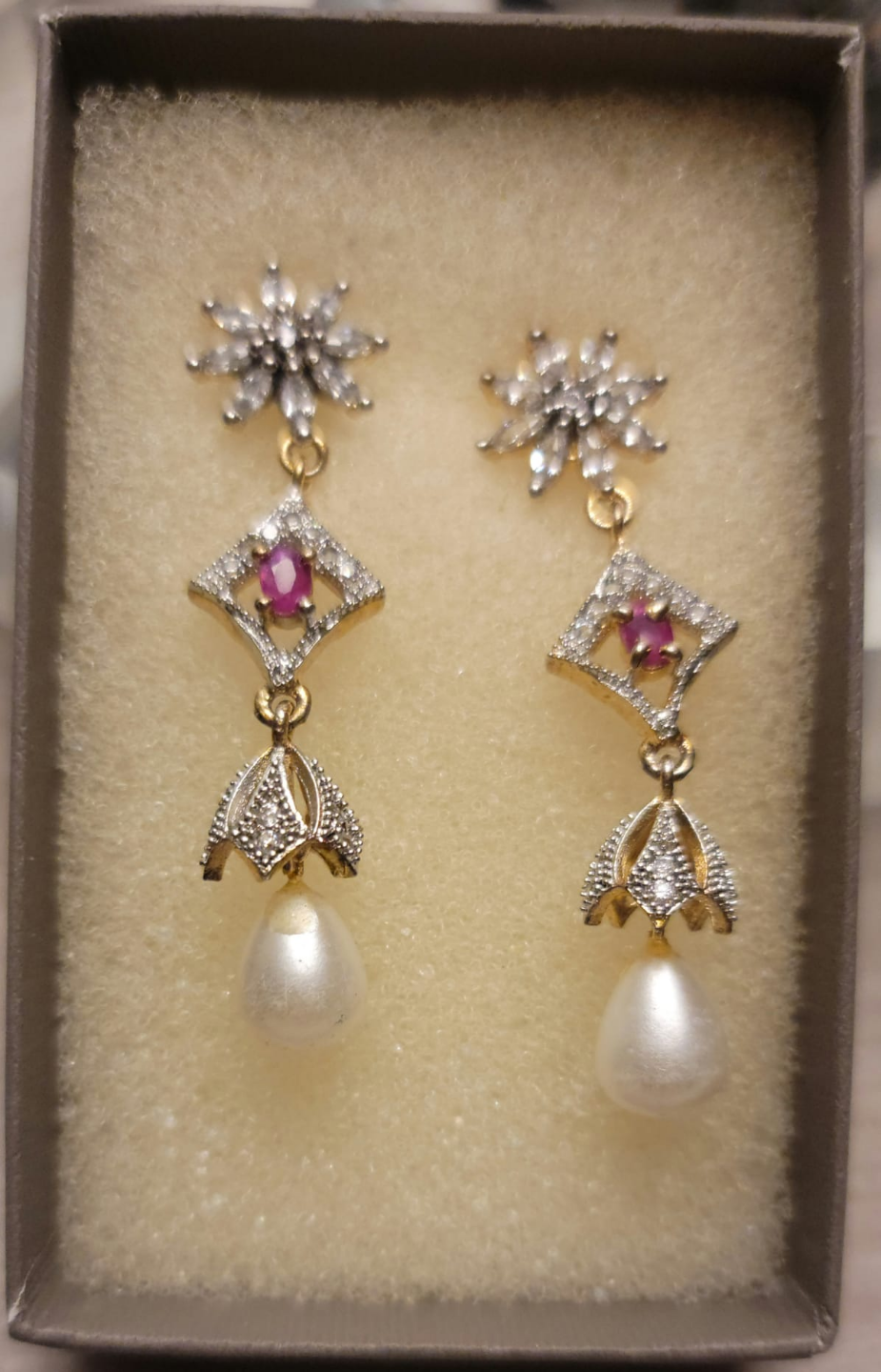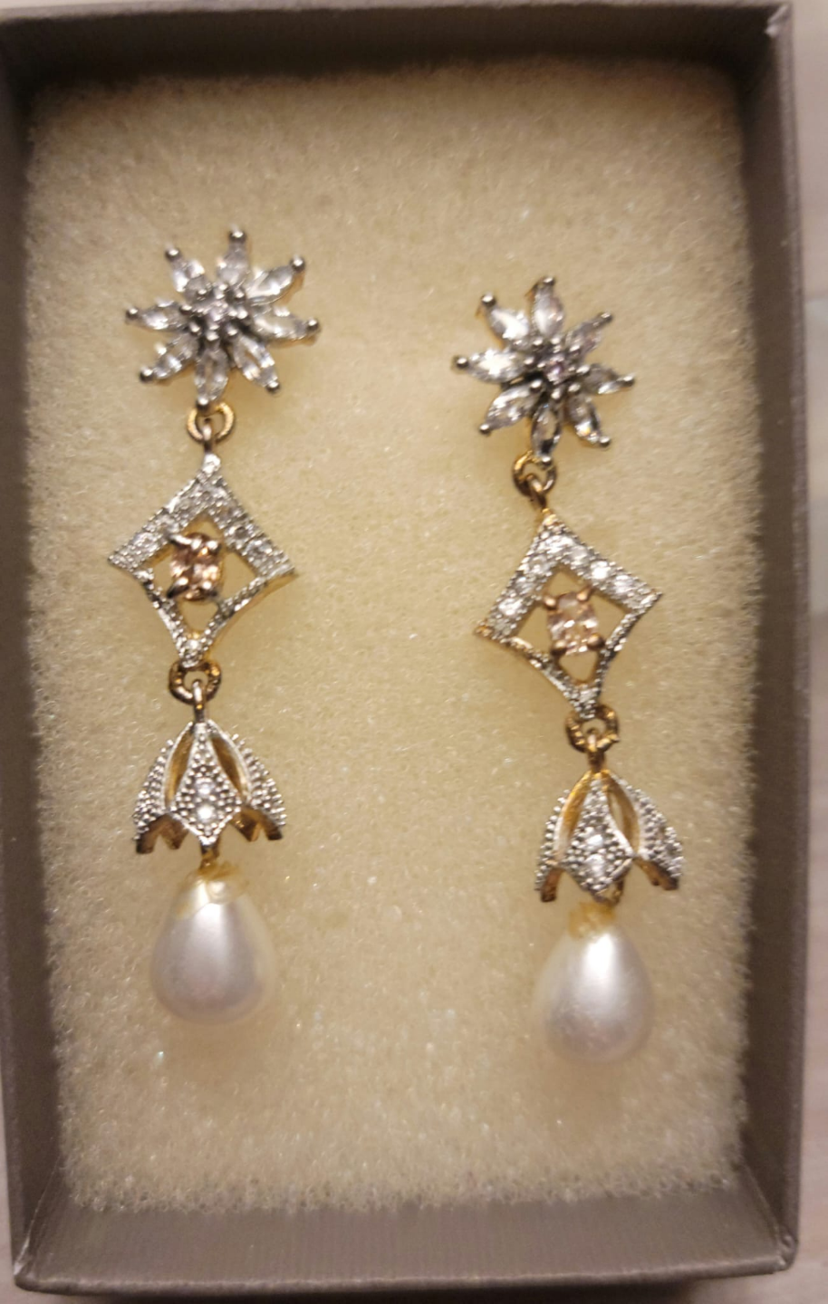 Beautiful dangle earrings. Features a pearl drop, CZ stones, and a floral design. Gold-toned metal. Perfect for adding a touch of elegance to any outfit.