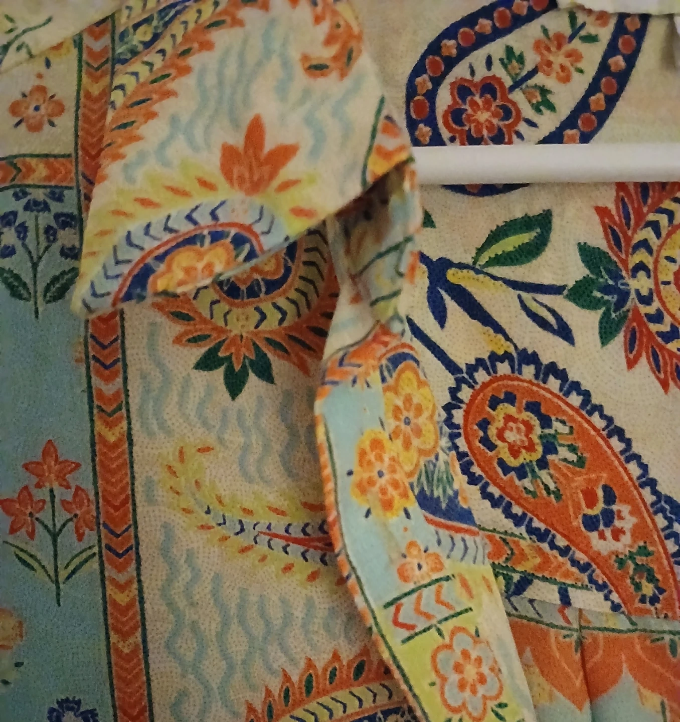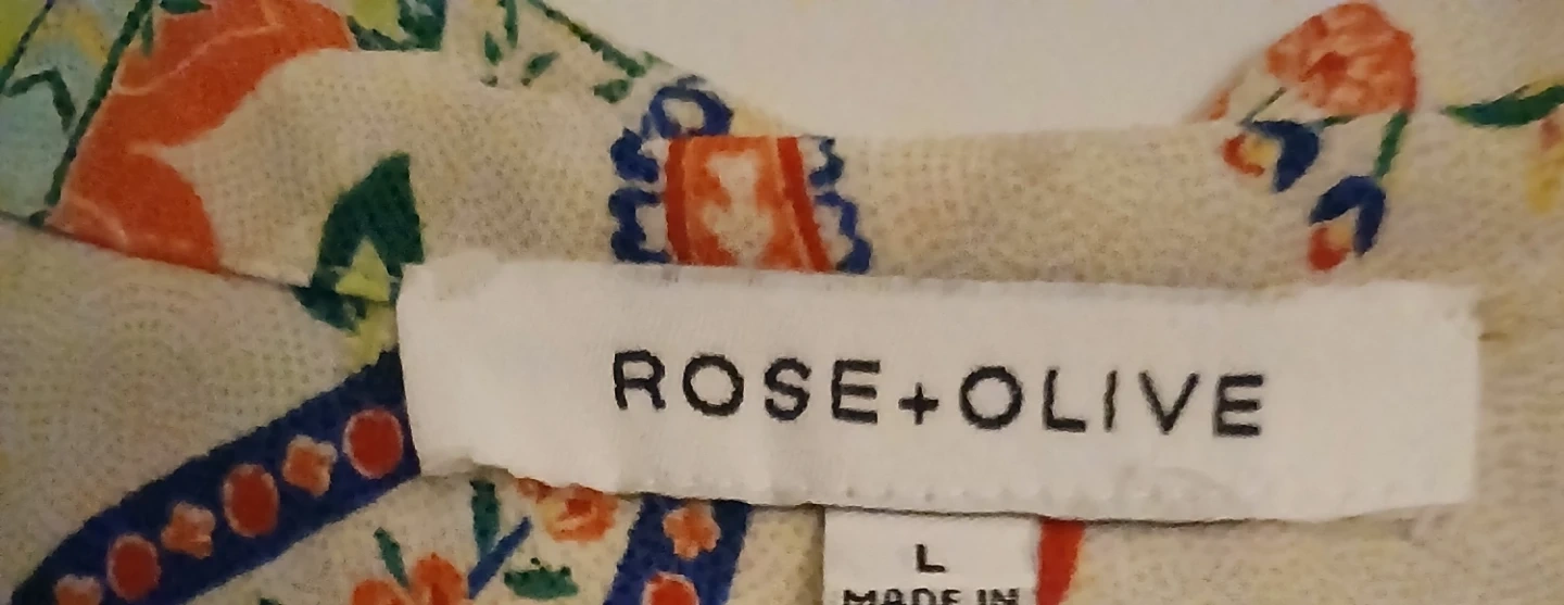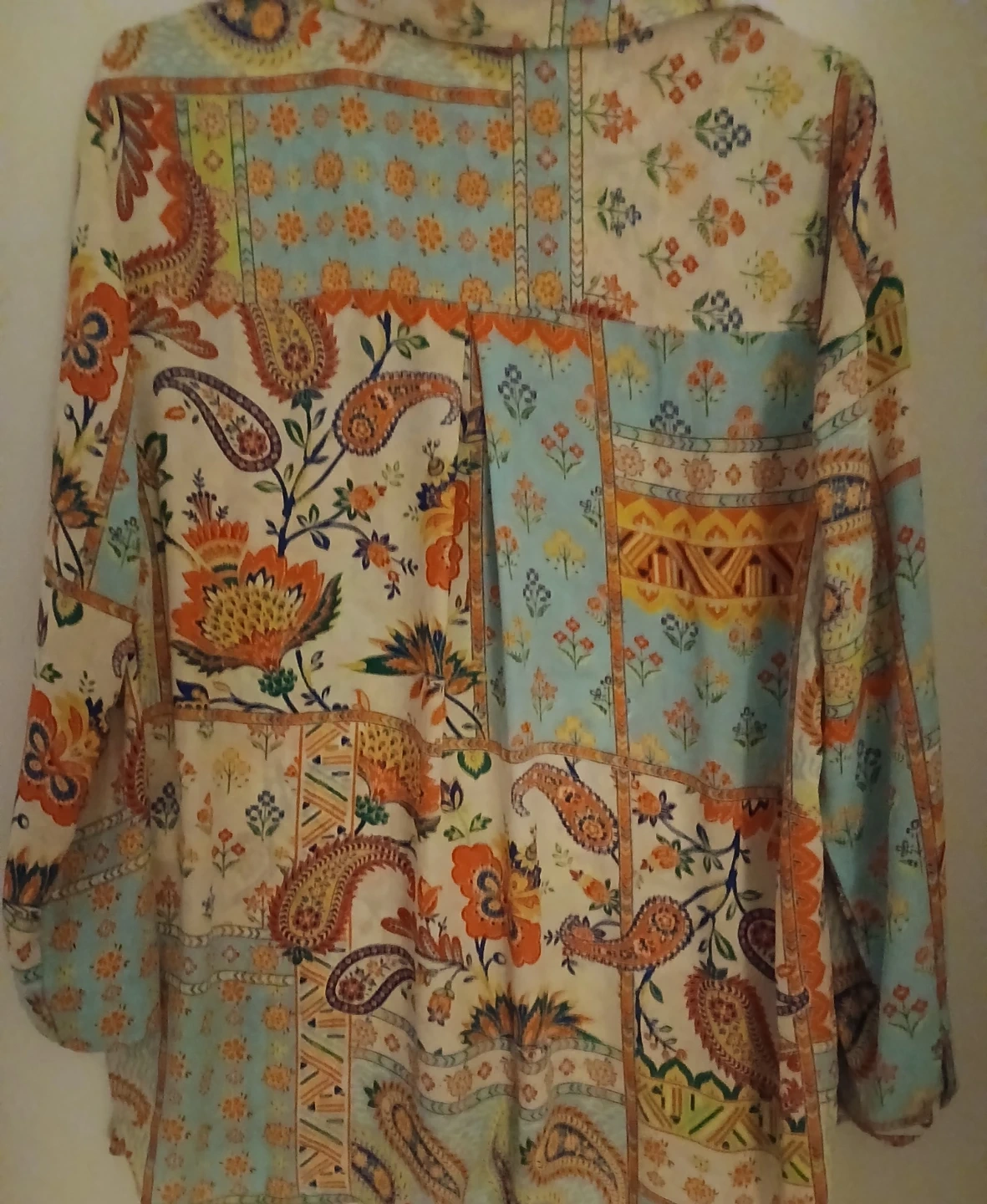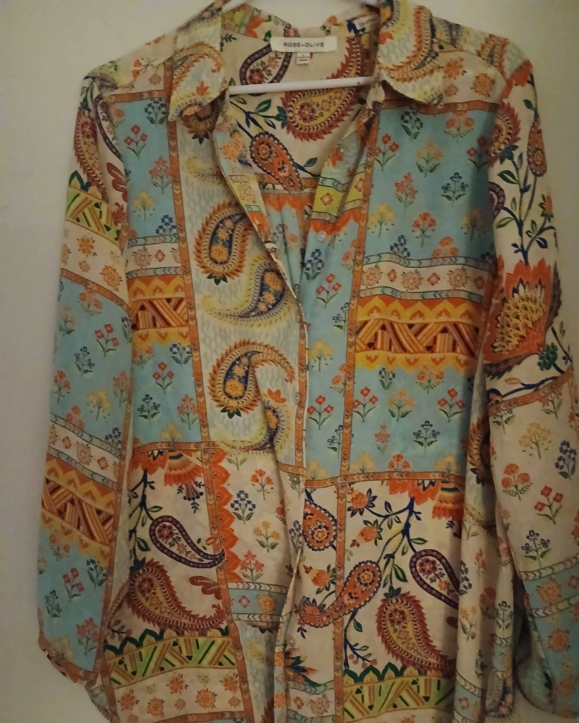 Rose + Olive collared button-up shirt with a colourful paisley and floral print. It's a size large. This top is perfect for adding a vibrant touch to any outfit!