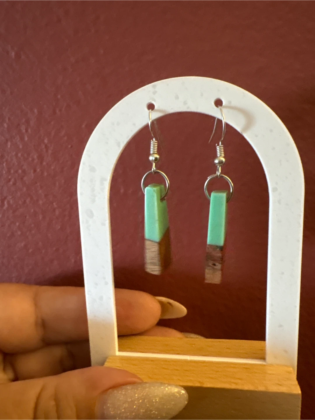 Handmade wood and resin dangle earrings from Fai & Nm Designs. Features a modern geometric design with light green resin and natural wood. Includes original gift box.