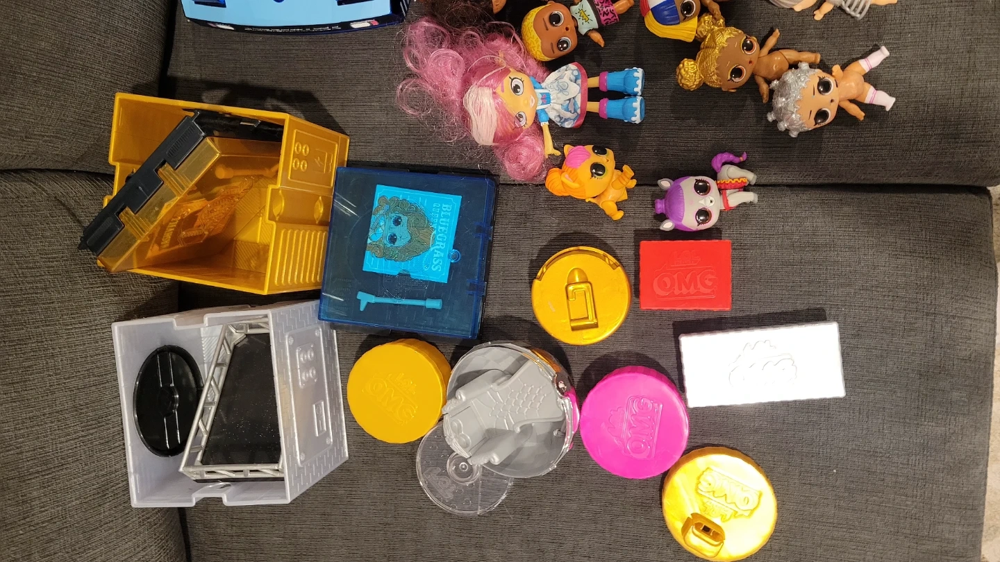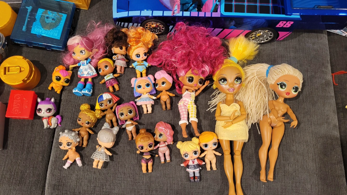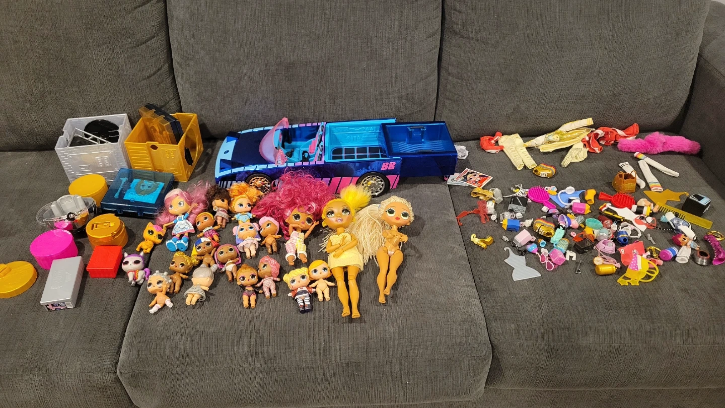 This lot includes multiple LOL Surprise dolls and tons of accessories. Also features a large blue and pink toy car, perfect for playtime adventures! It's a fun collection for any LOL Surprise fan.