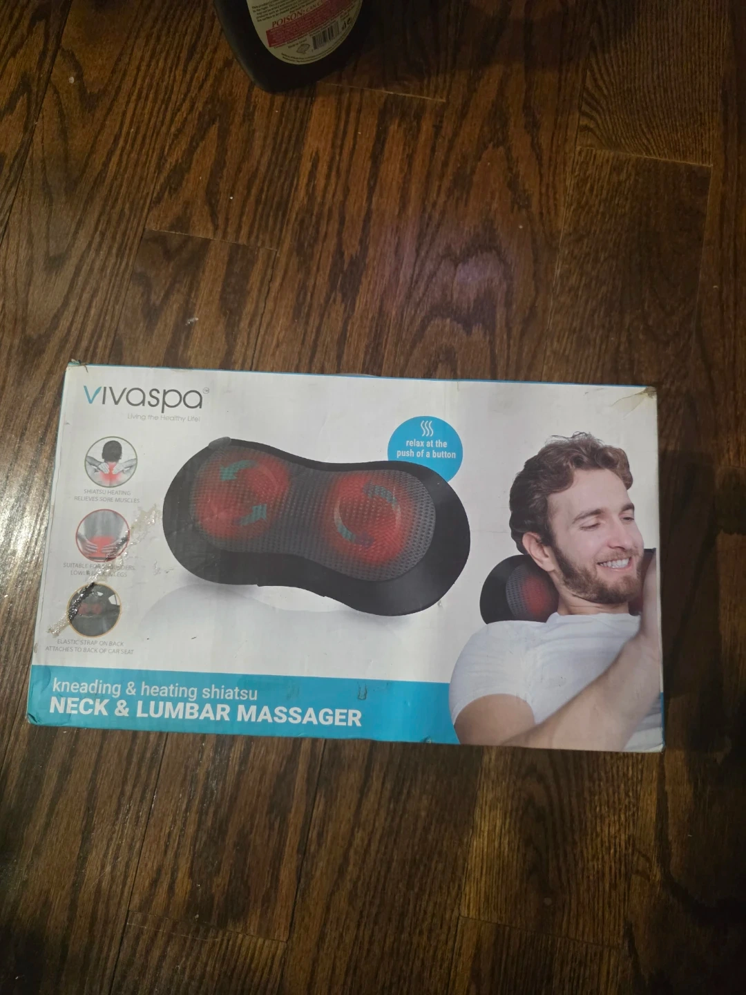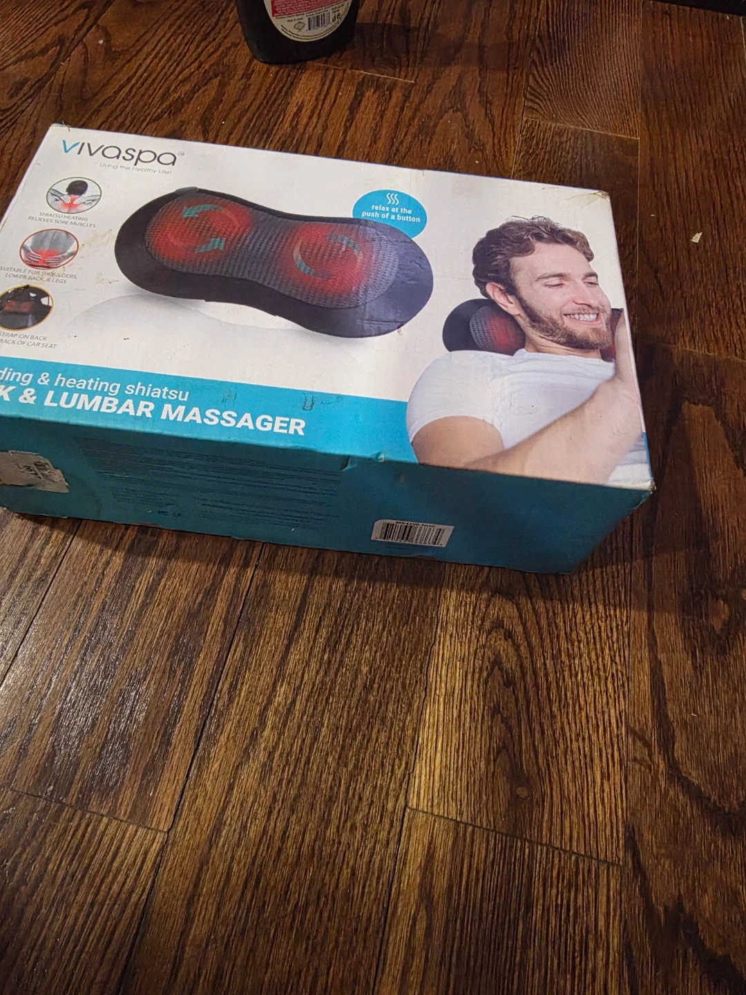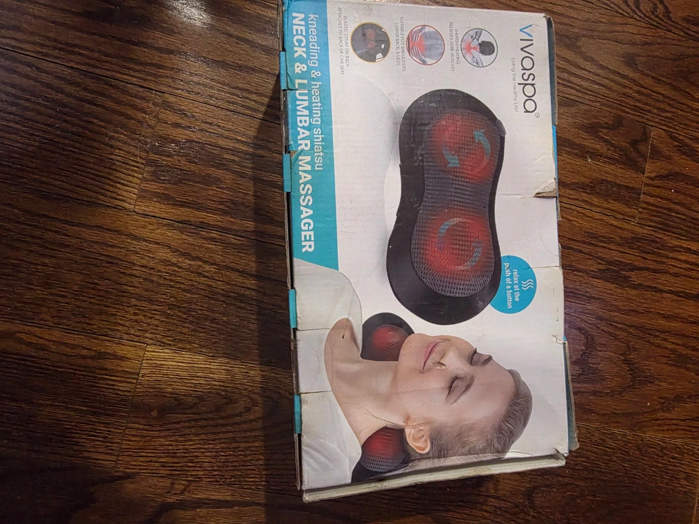 This VivaSpa massager offers kneading and heating shiatsu to relax muscles. It's designed for neck and lumbar areas and includes original packaging. Features adjustable straps for car seat attachment.