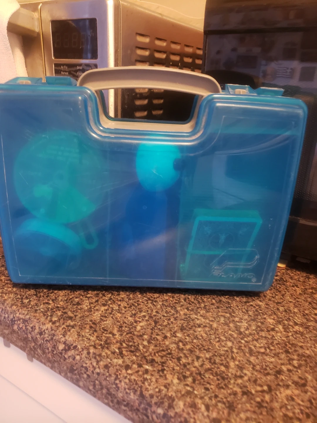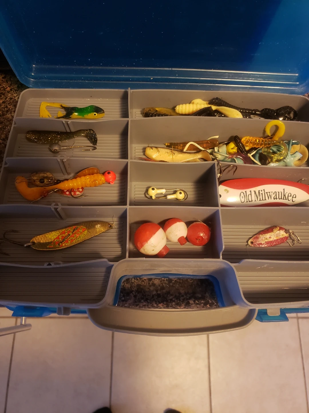 This blue fishing tackle box comes with a variety of lures, bobbers, fishing line, and sinkers. It's organized with multiple compartments for all your fishing needs. A great starter kit for any angler!