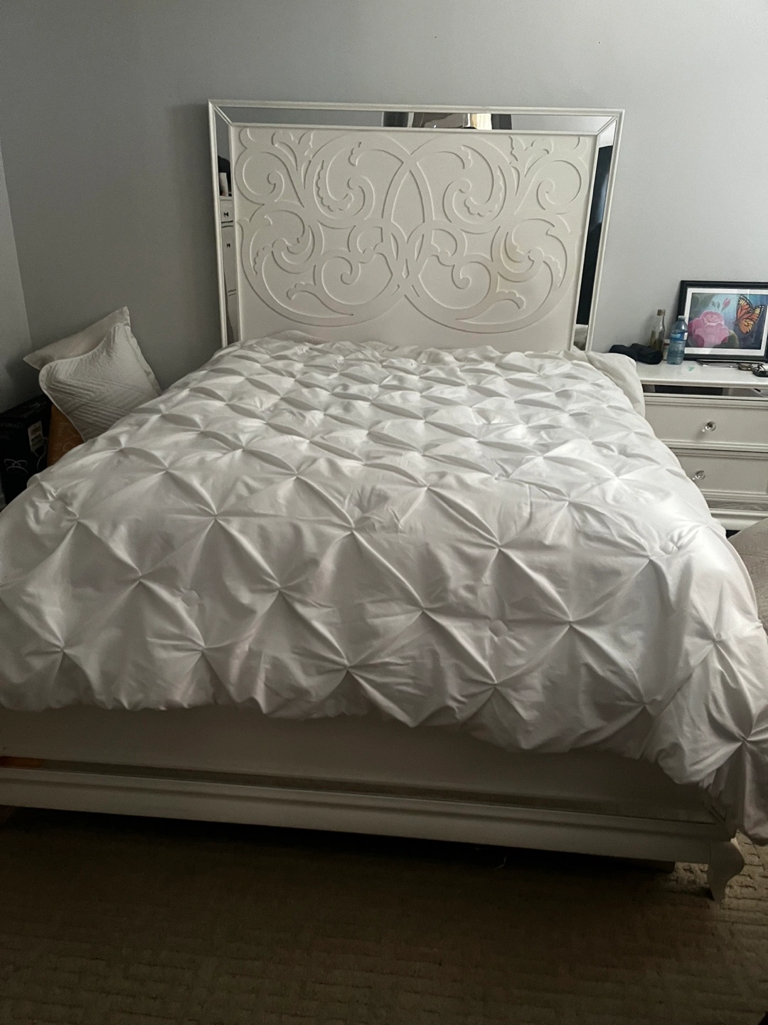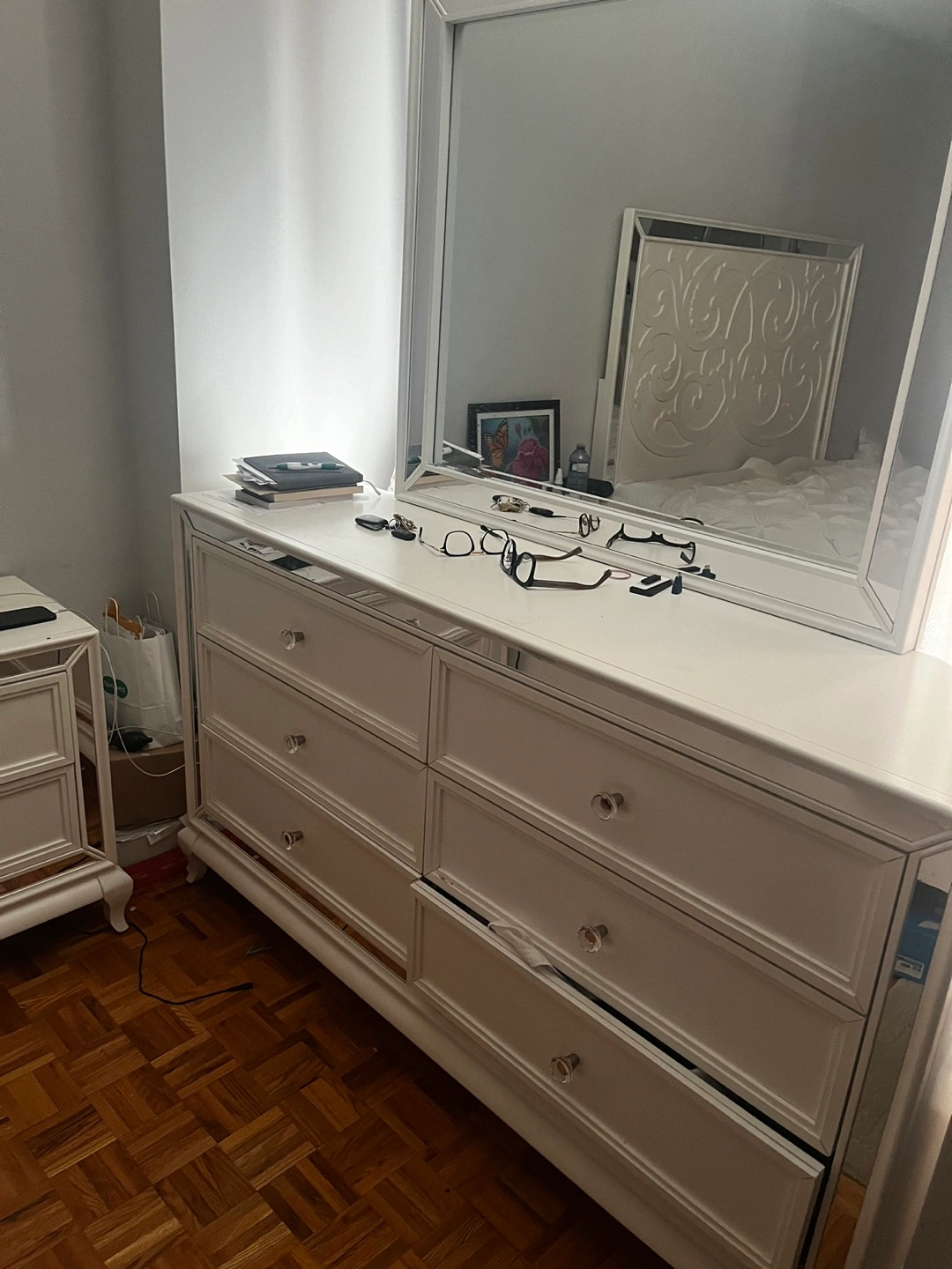 Selling a white dresser with a mirror and matching nightstand. The set has a classic, elegant design with crystal-like knobs. Perfect for adding a touch of sophistication to your bedroom!