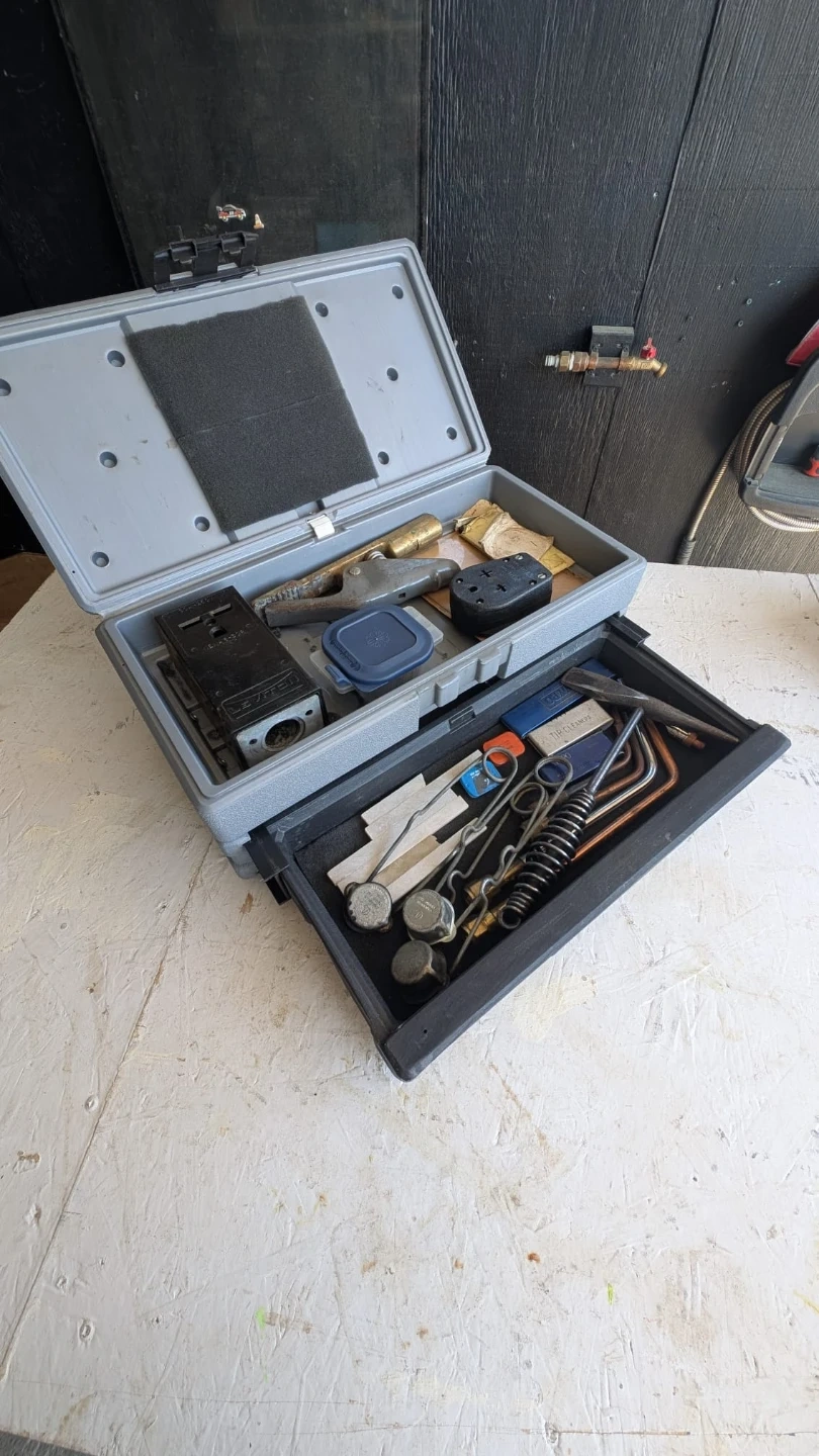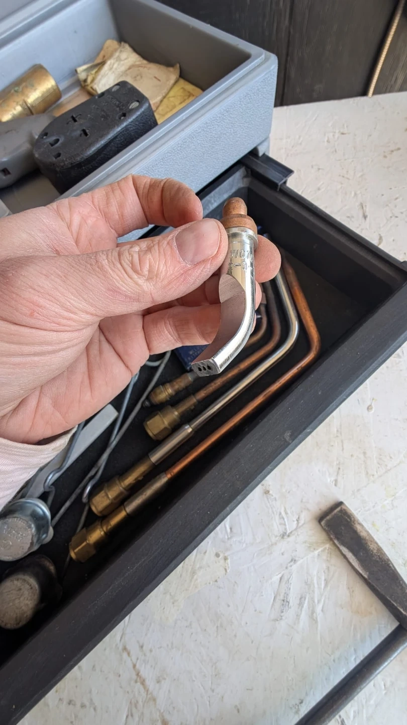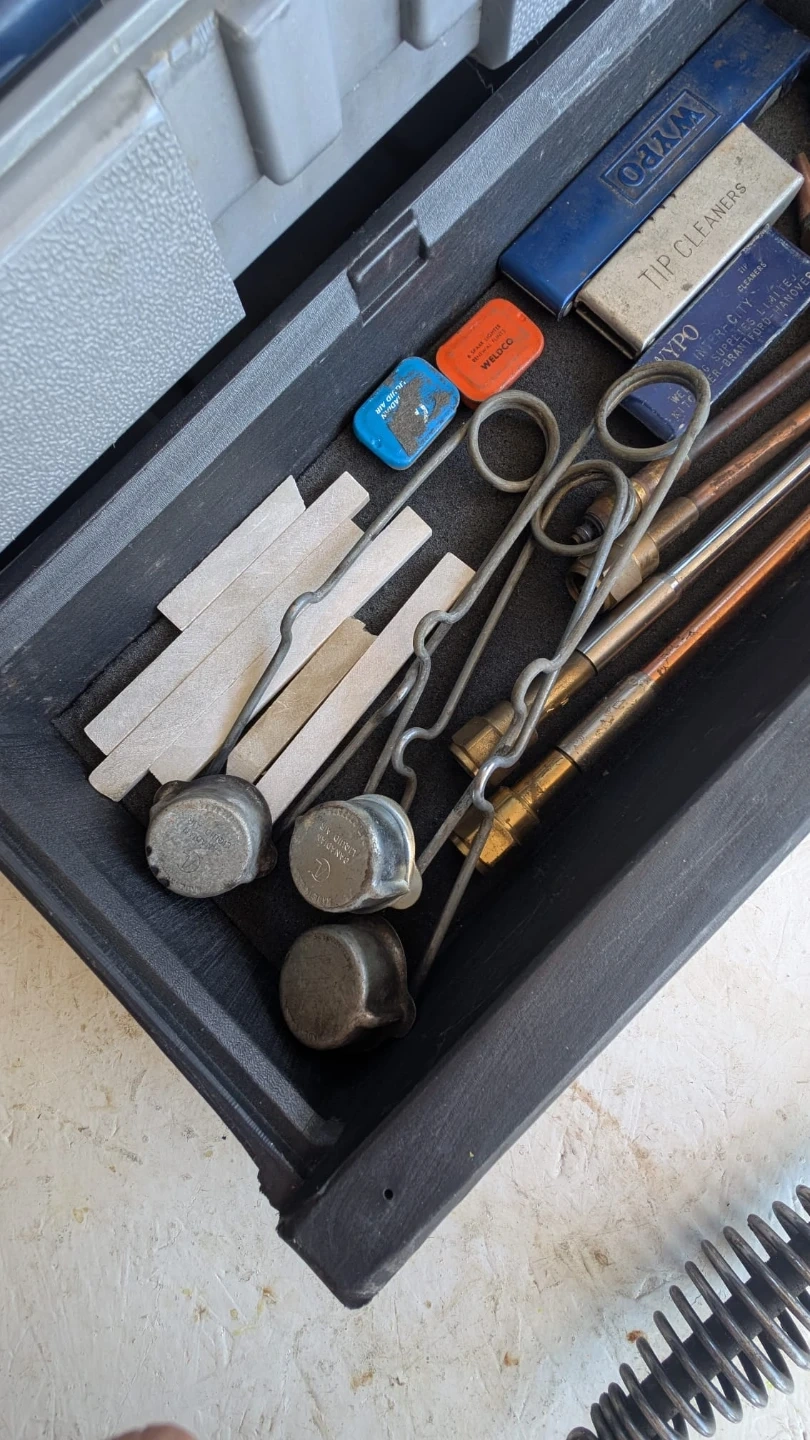 This set includes Victor welding and cutting torch with assorted tips and tip cleaners. Also comes with a welding chipping hammer and a plastic carrying case. Oxy-acetylene