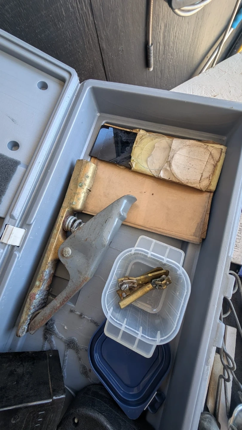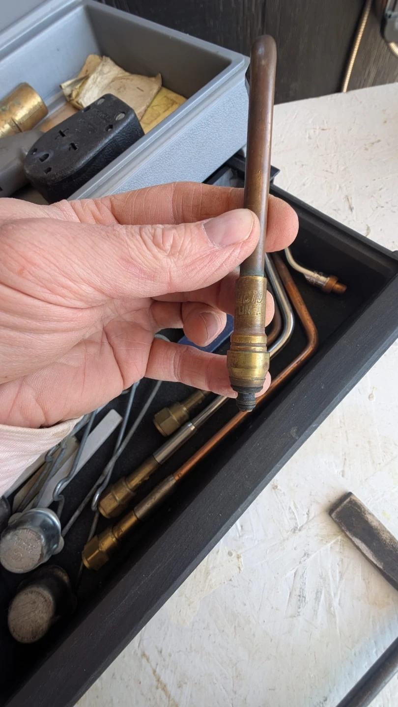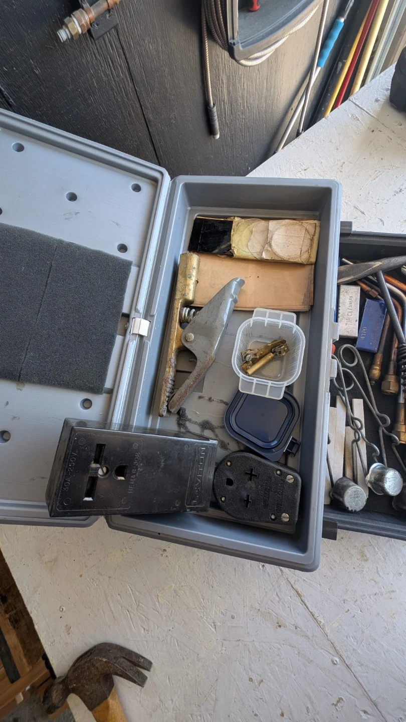 This set includes Victor welding and cutting torch with assorted tips and tip cleaners. Also comes with a welding chipping hammer and a plastic carrying case. Oxy-acetylene