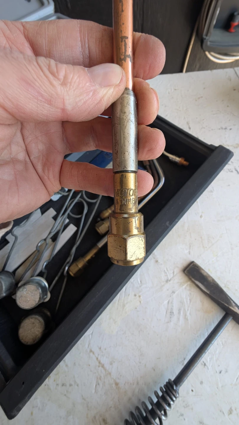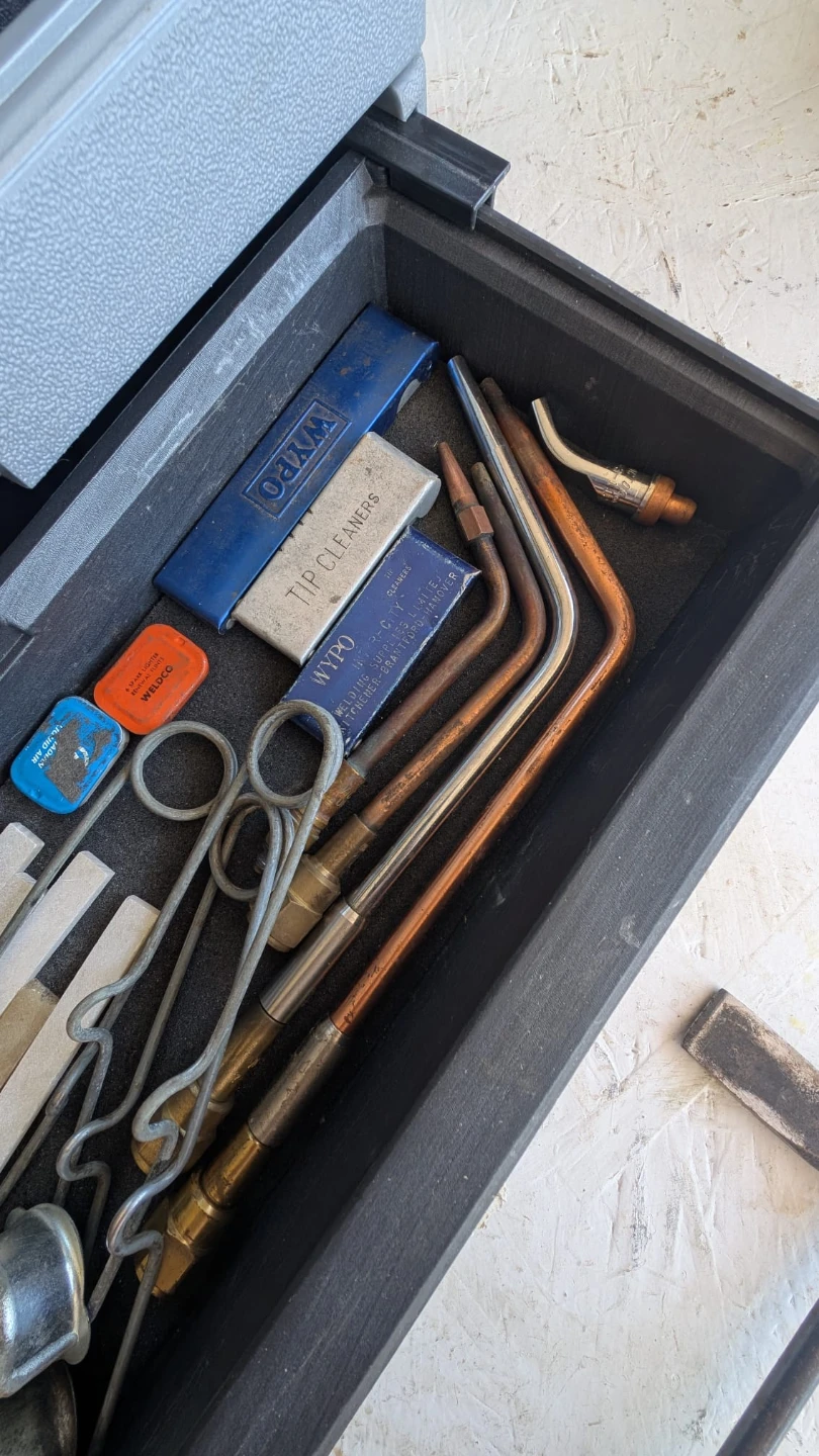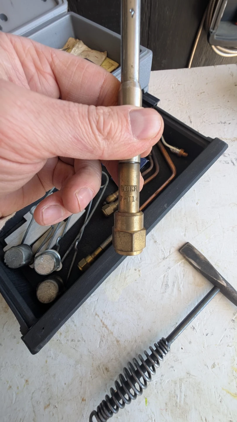 This set includes Victor welding and cutting torch with assorted tips and tip cleaners. Also comes with a welding chipping hammer and a plastic carrying case. Oxy-acetylene