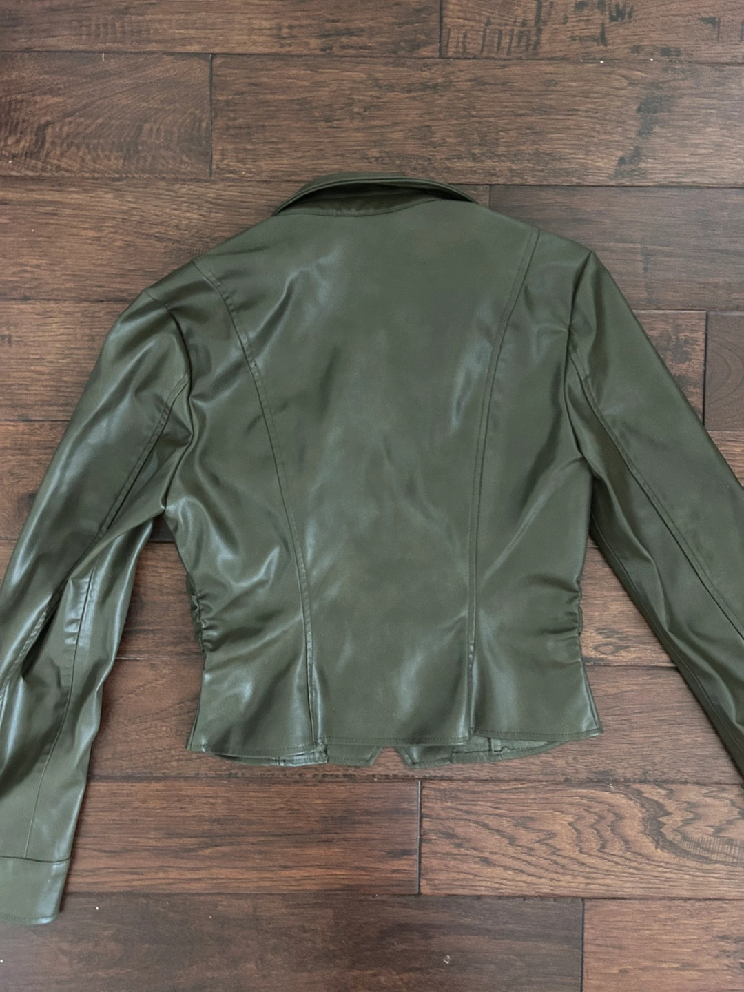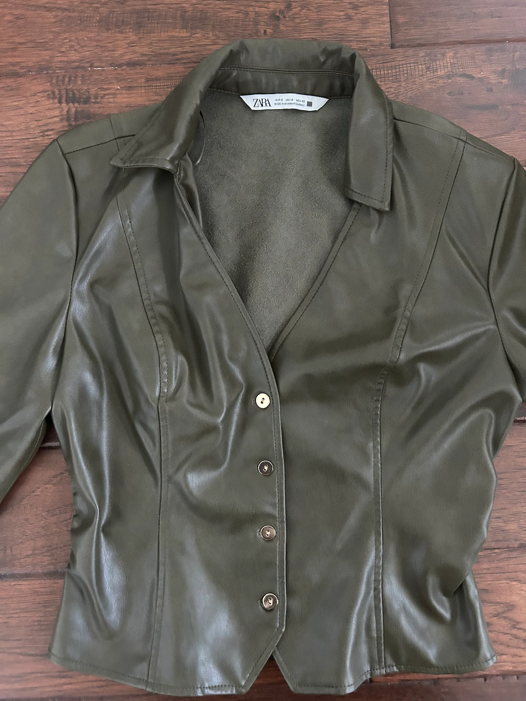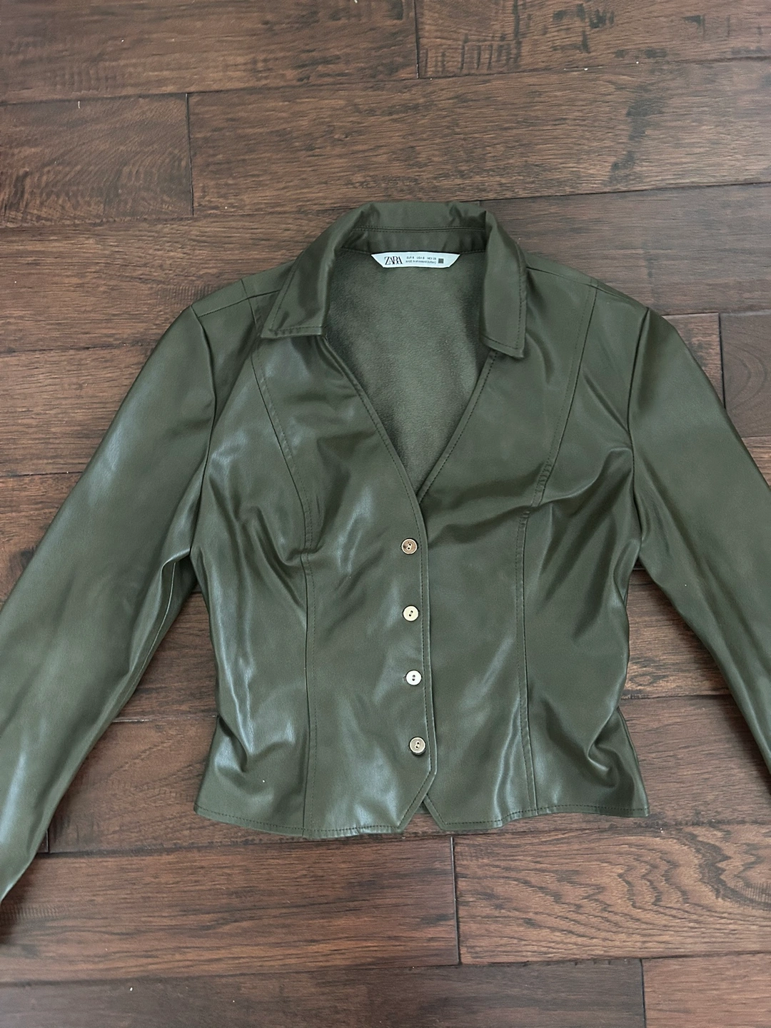 This is a Zara faux leather top in a beautiful olive green colour. It has a collared neckline, long sleeves, and a button-up front. The top is has a side ruching and cropped, and it would be perfect for dressing up an outfit or adding a touch of edge to a casual look.