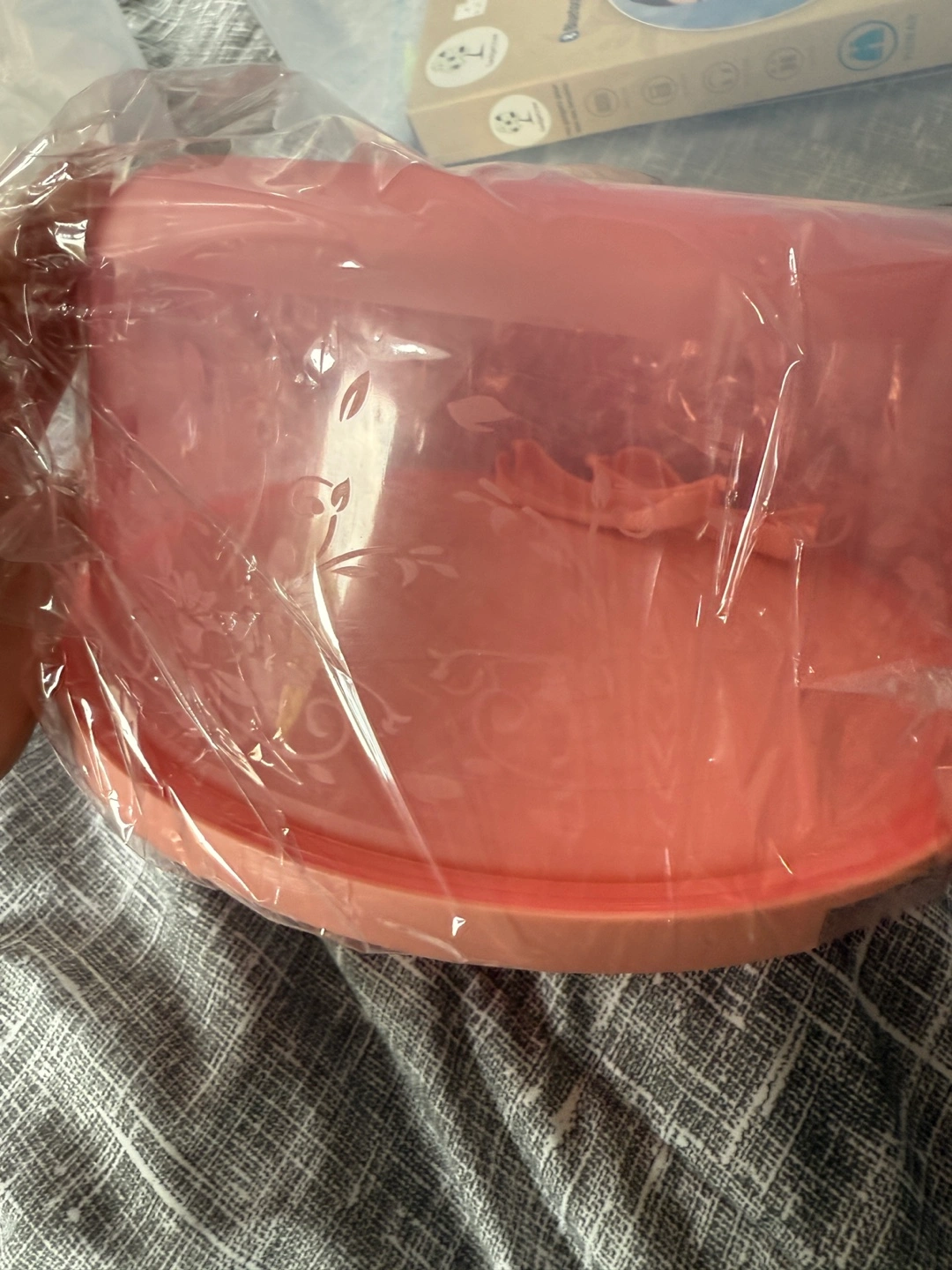 Unused pink plastic cake carrier. Round shape with a clear plastic dome lid. Floral design on the base. Perfect for transporting cakes or other baked goods.