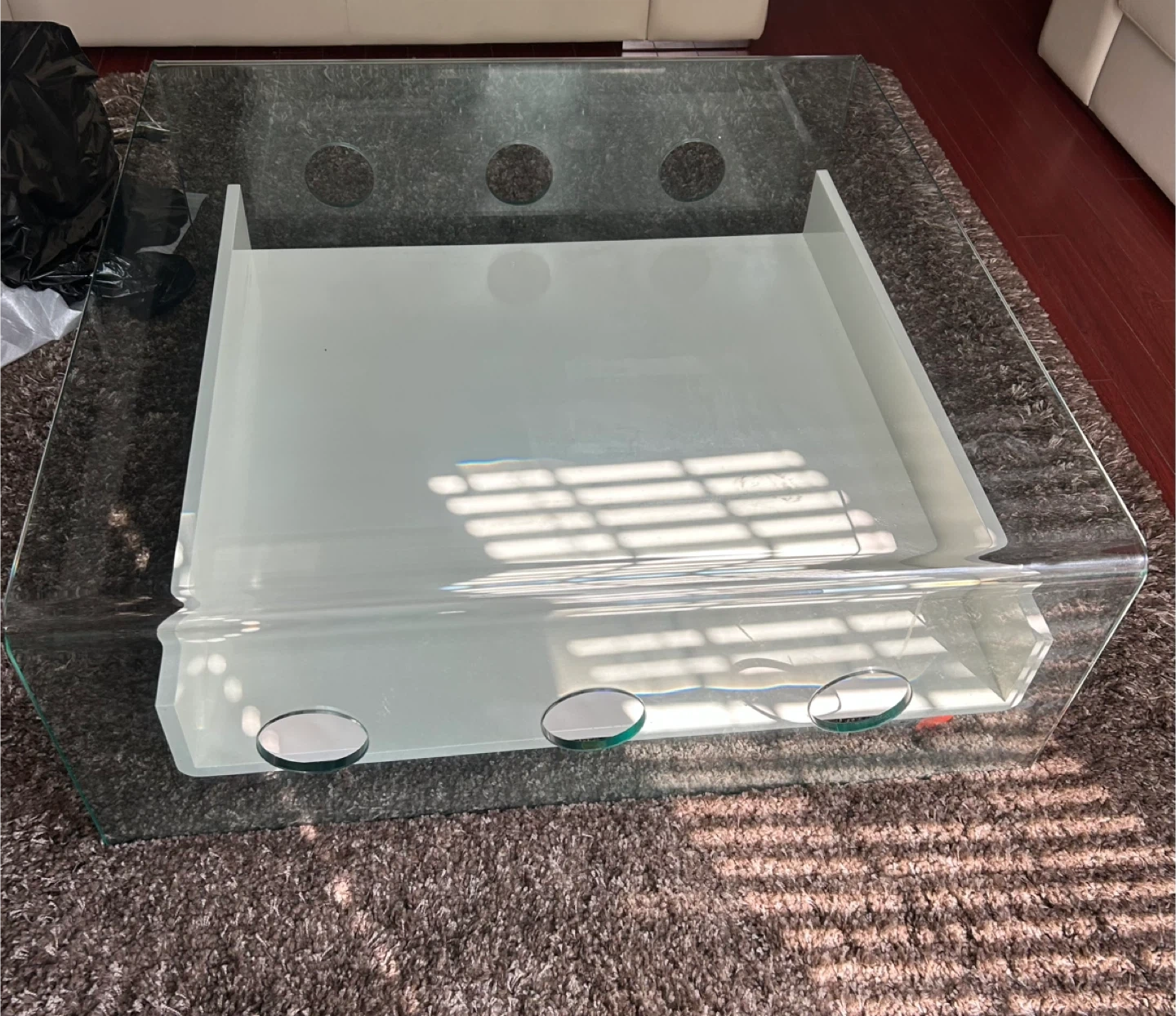 Selling a glass coffee table. It's a stylish piece that would look great in any living room. It has a white base and a clear glass top. Cash only. Pickup Only.