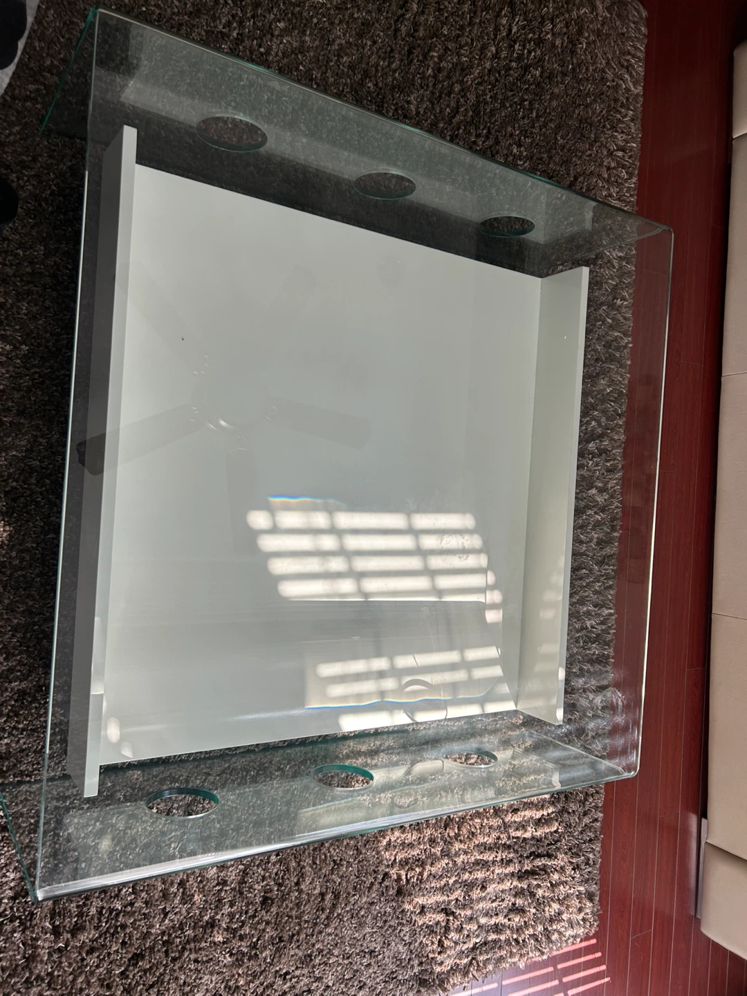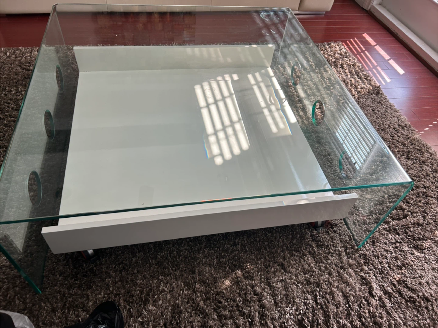 Selling a glass coffee table. It's a stylish piece that would look great in any living room. It has a white base and a clear glass top. Cash only. Pickup Only.