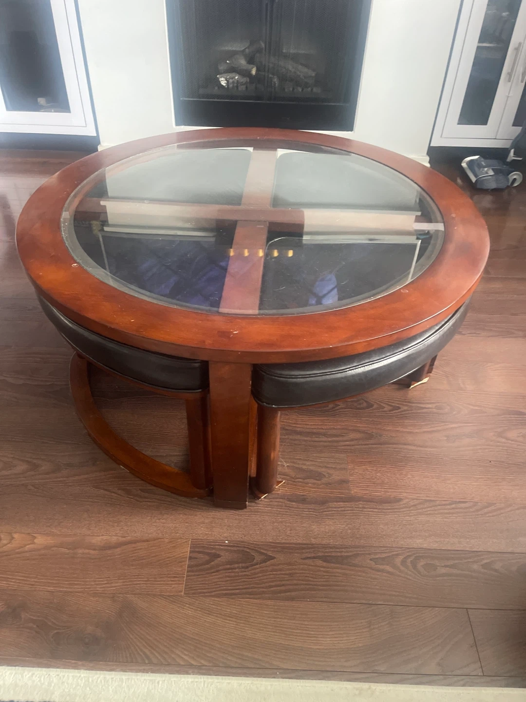 This round dining table features a glass top with a rich wood trim and a sturdy wooden base. It comes with four black faux leather stools that tuck neatly underneath. It's great for small spaces and casual dining!one chair is broken see pictures.