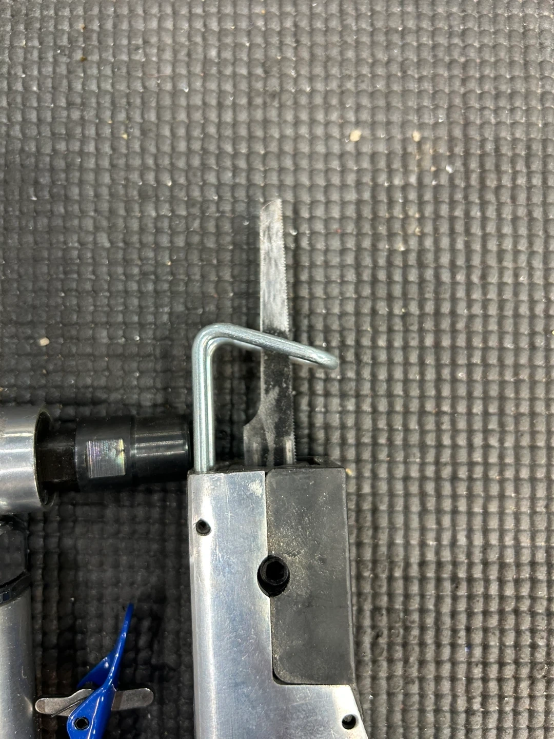 Durable Power Fist pneumatic tool set includes one reciprocating saw and one 90-degree angle die grinder. Both tools are constructed with silver metal bodies and feature blue rubberized grips for comfort. Set comes with two adjustment wrenches and red air hose quick-connect fittings already installed. Reciprocating saw has a metal blade guard and a black safety trigger lever.