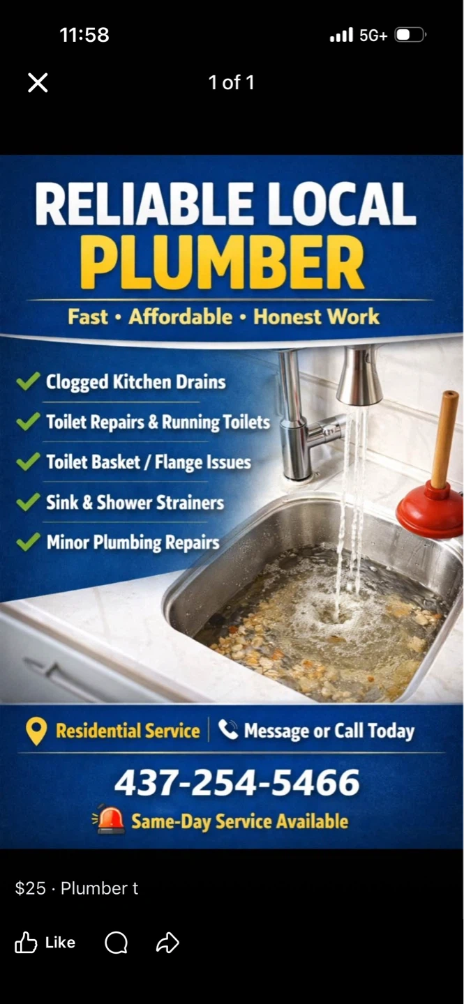Offers services including clogged kitchen drains, toilet repairs, sink and shower strainers, and minor plumbing repairs. Residential service is available. Message or call today for same-day service!