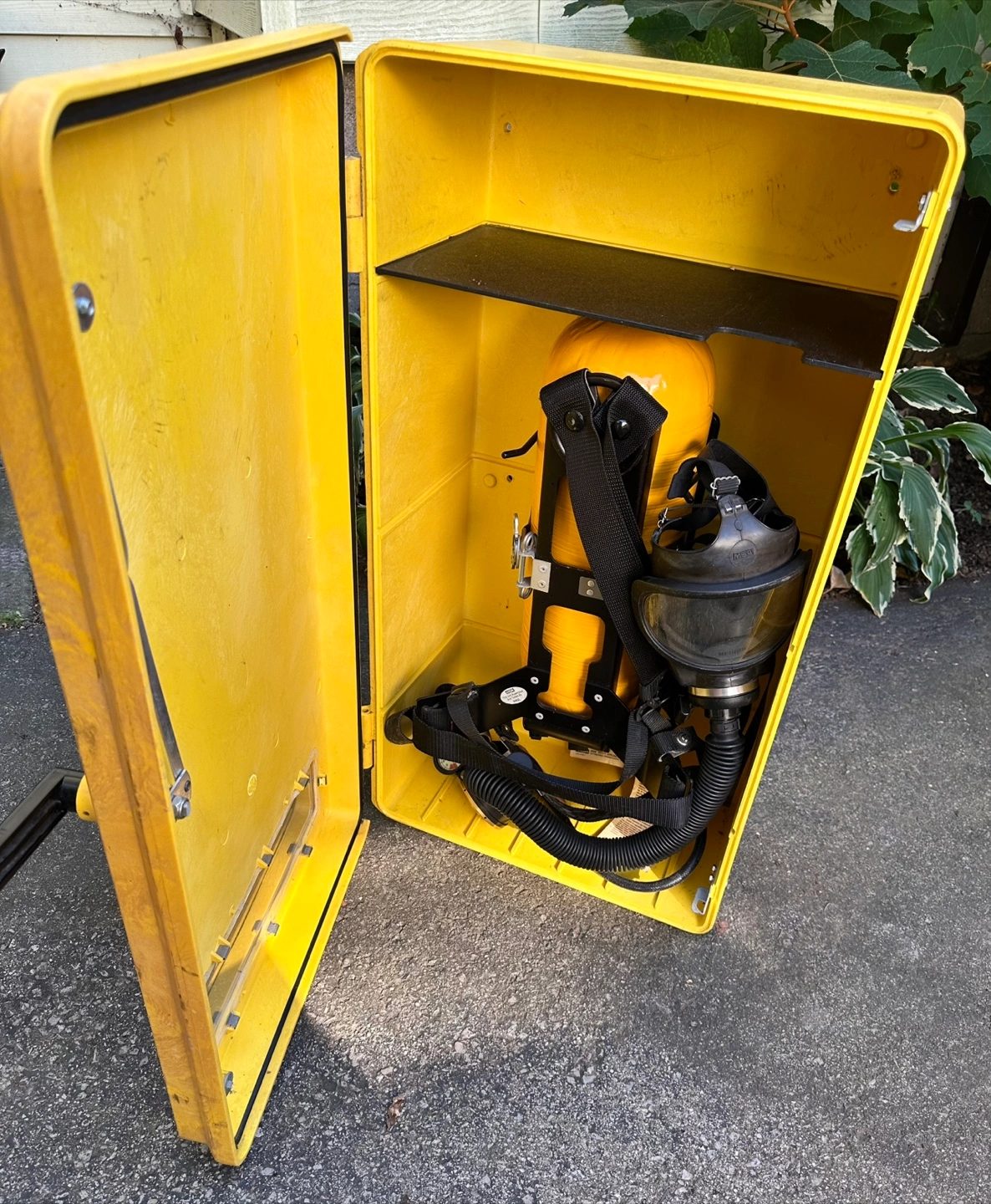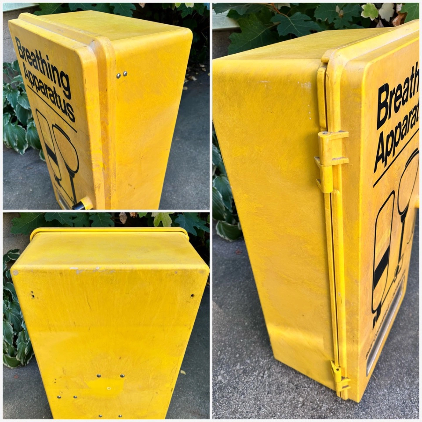 👉🏼 Pickup in Waterdown This very unusual and unique item is sure to draw attention and may be practical too! In storage for years, it will need to be tested and air tank filled before any attempted use but it’s a rare safety breathing unit and 30 minute air supply tank - complete with mask, regulator, hoses and wall cabinet to mount. See photos for measurements and detail. Super cool find for a man cave or garage! Decor and functional (after testing). Google image search shows comparable and some cabinets only selling for $1,000!