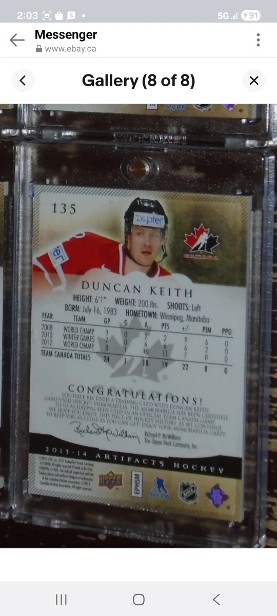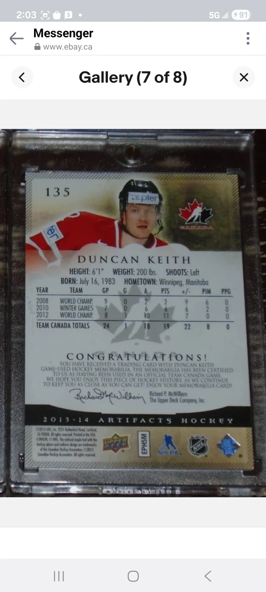 Selling a Duncan Keith Artifacts hockey card. Team Canada patches. Card is in great condition!Remember cards and items can be shipped Canada wide for an extra $10 with tracking. The Paypal invoice will be sent for our assurance and security of purchase and sale. You may also choose to use interact with your confidence.