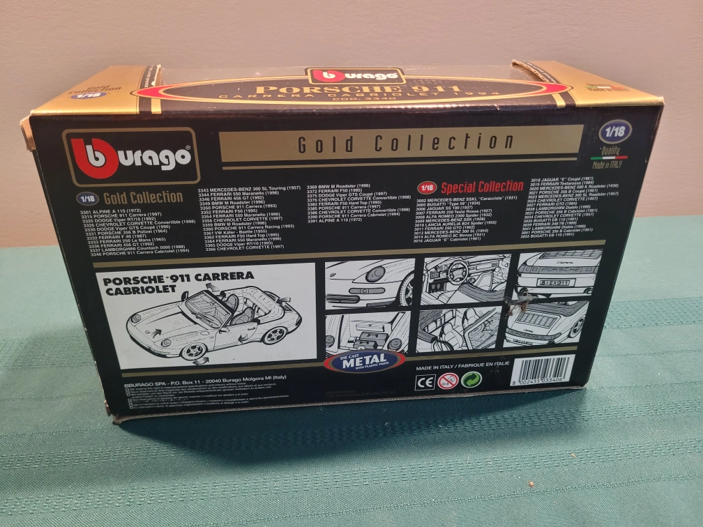 A Burago 1/18 scale diecast model of a Porsche 911 Carrera Cabriolet 1994. The model is in its original box. Made in Italy, unlike newer models which are made in Thailand.
