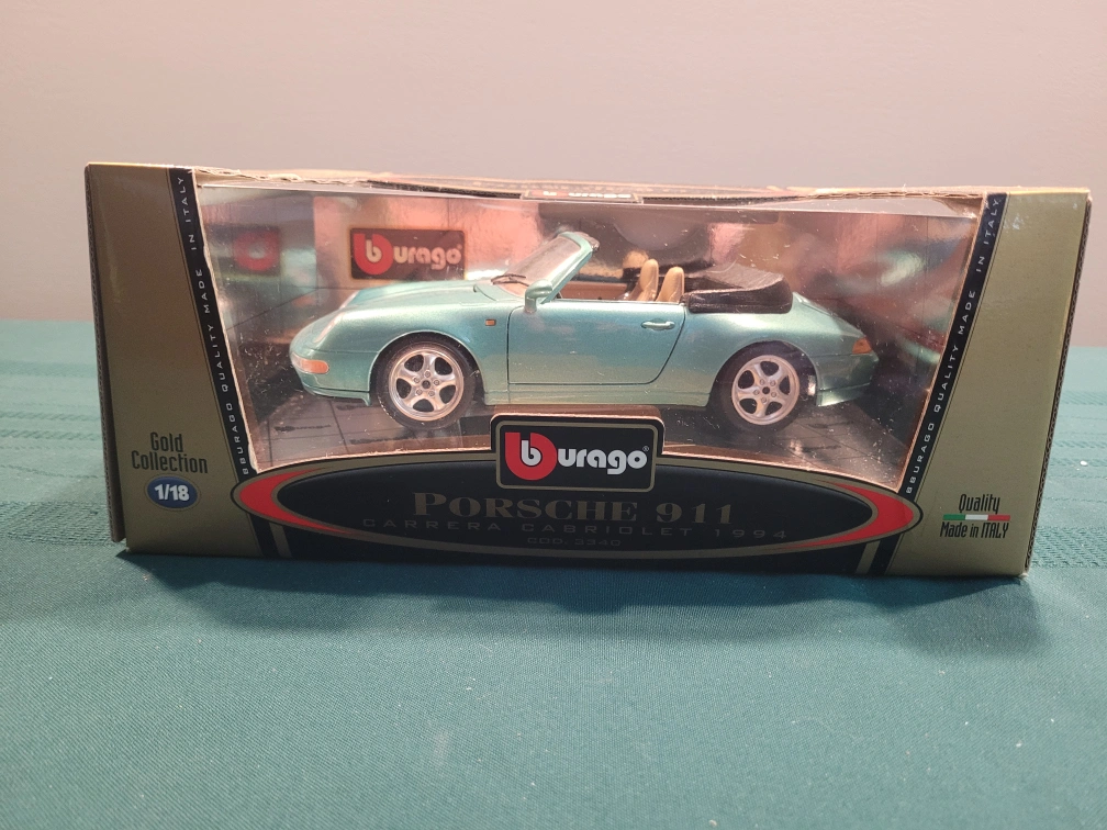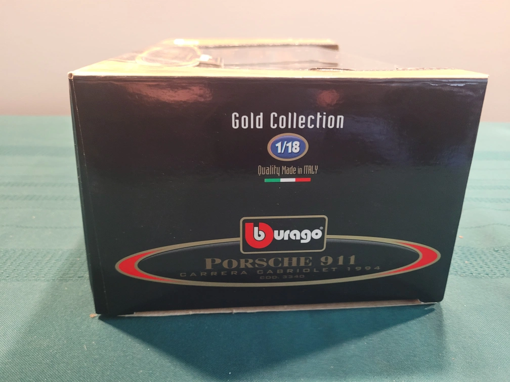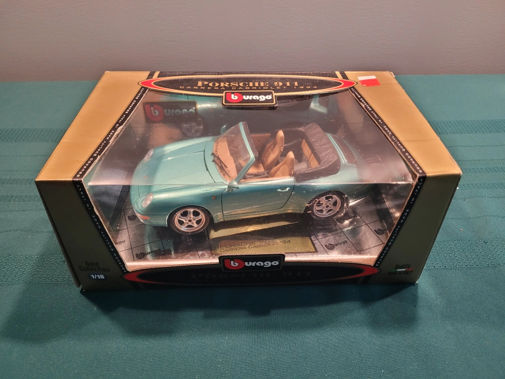 A Burago 1/18 scale diecast model of a Porsche 911 Carrera Cabriolet 1994. The model is in its original box. Made in Italy, unlike newer models which are made in Thailand.