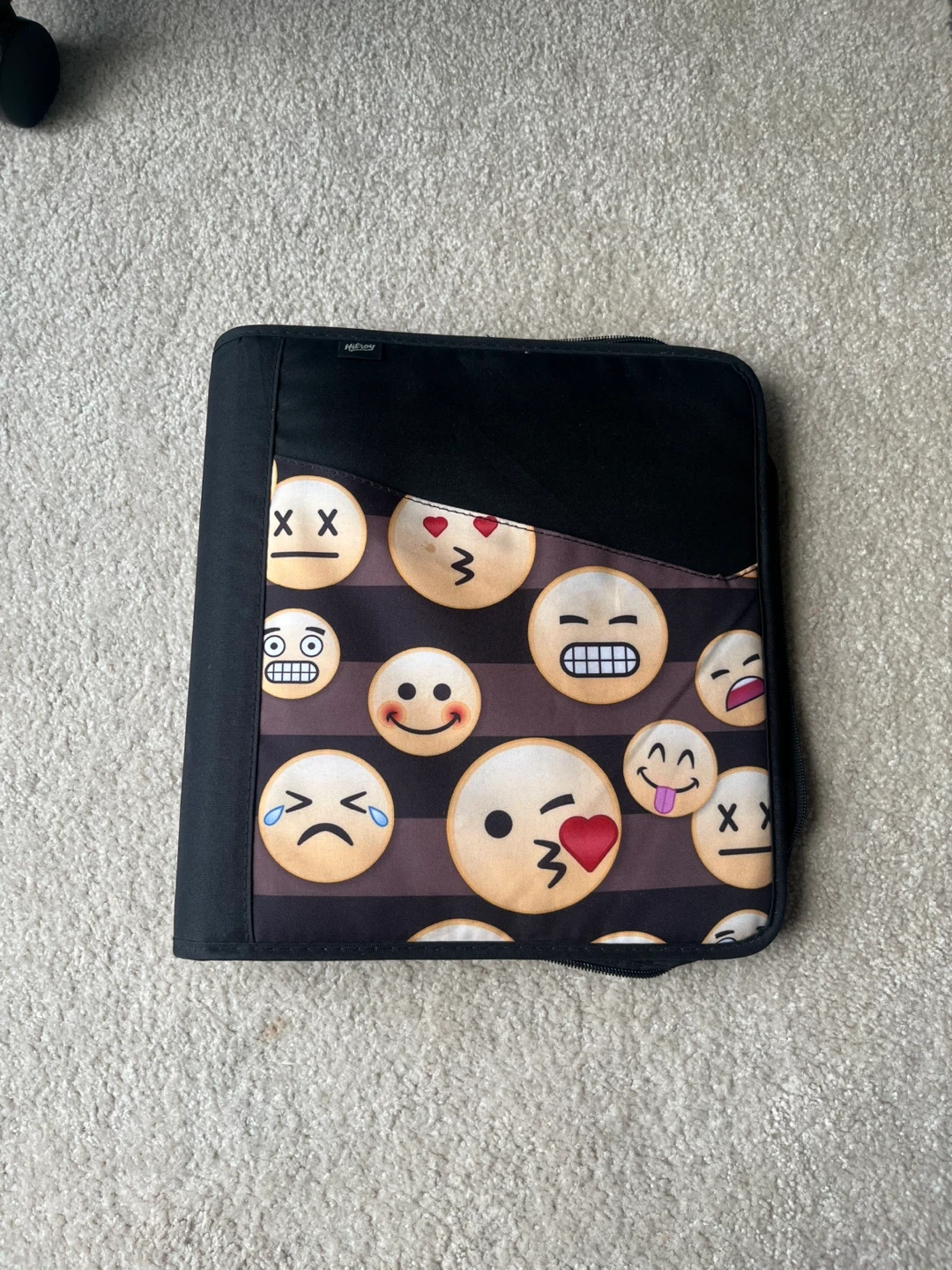 Selling a zipper binder with a fun emoji design! It's in good shape also includes some plastic dividers, great for organizing files and work.