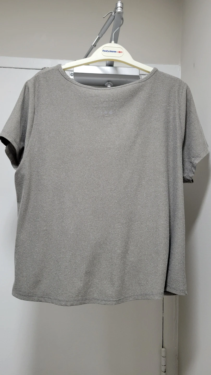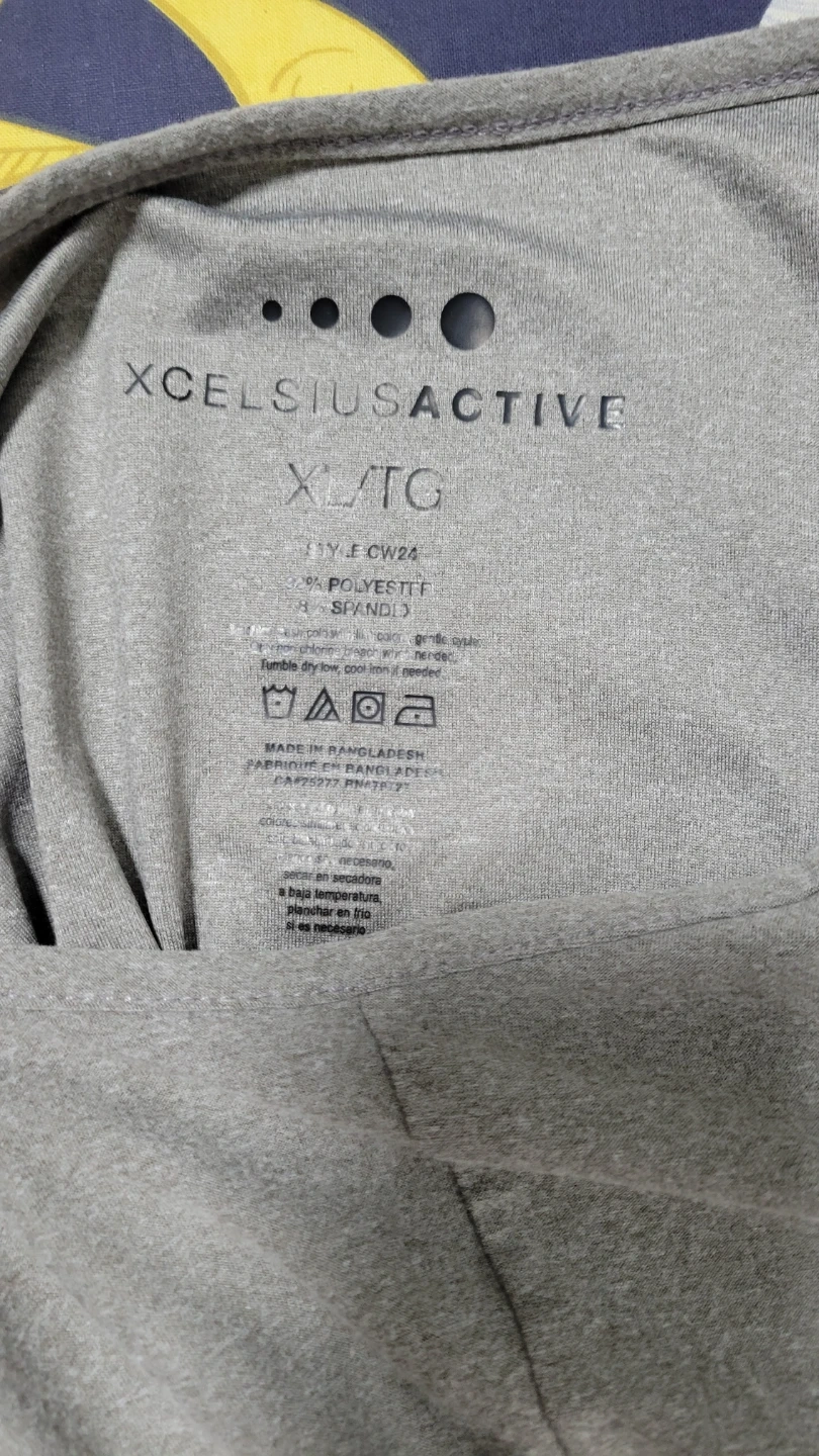 This grey athletic shirt from XCELSIUS ACTIVE. It's made with a blend of polyester and spandex for comfort and flexibility for sport activities. The shirt features a stylish twist front detail.