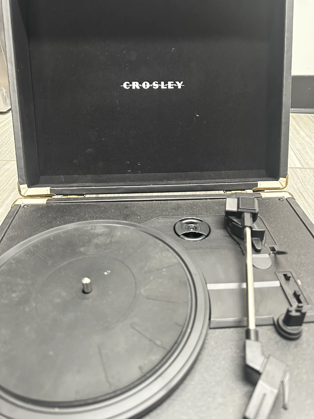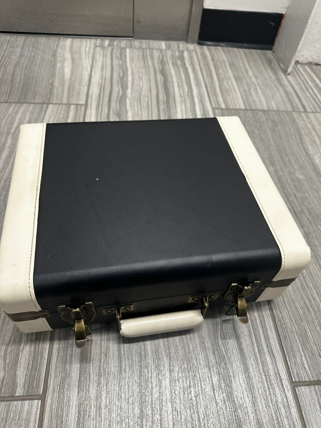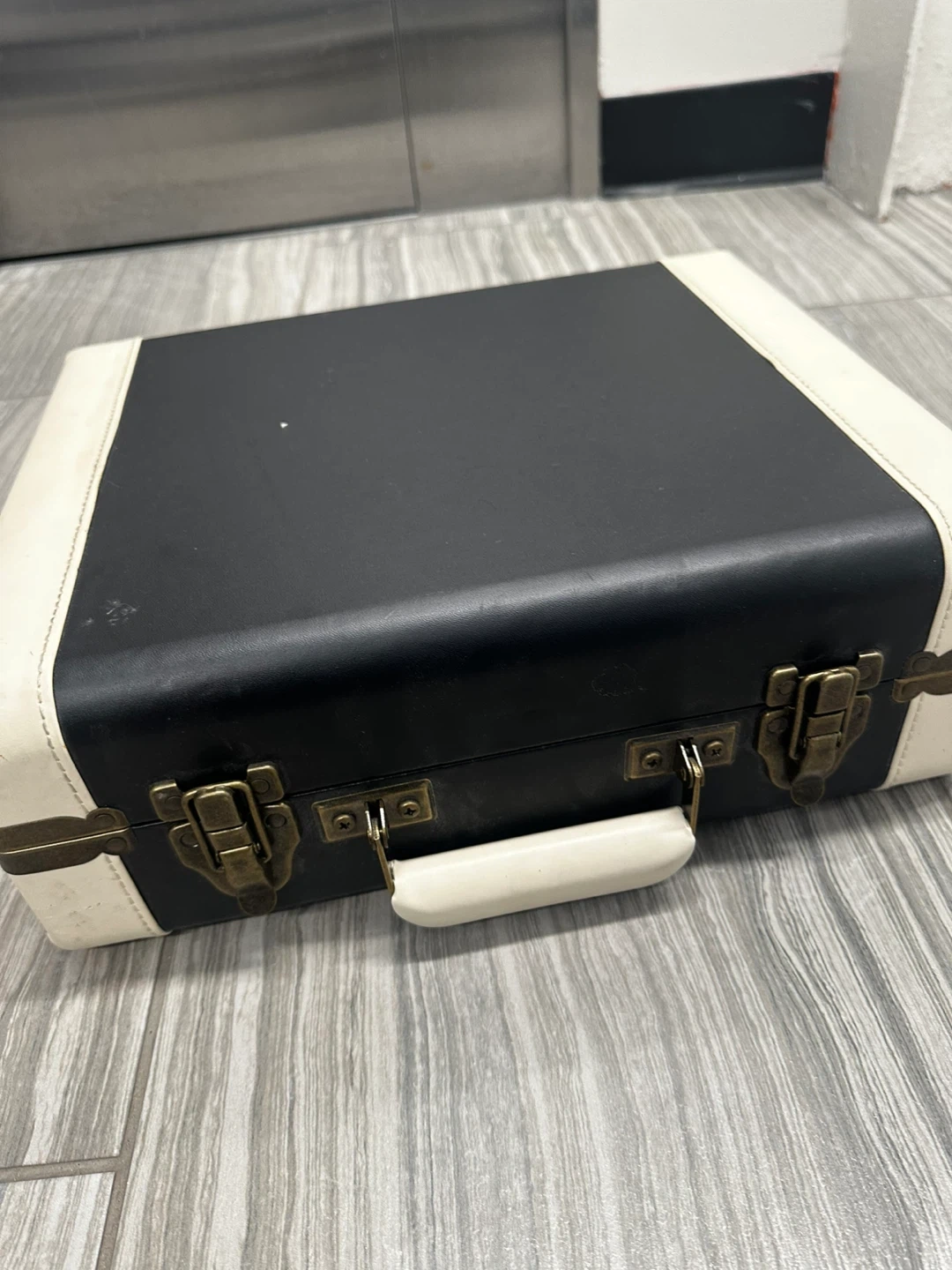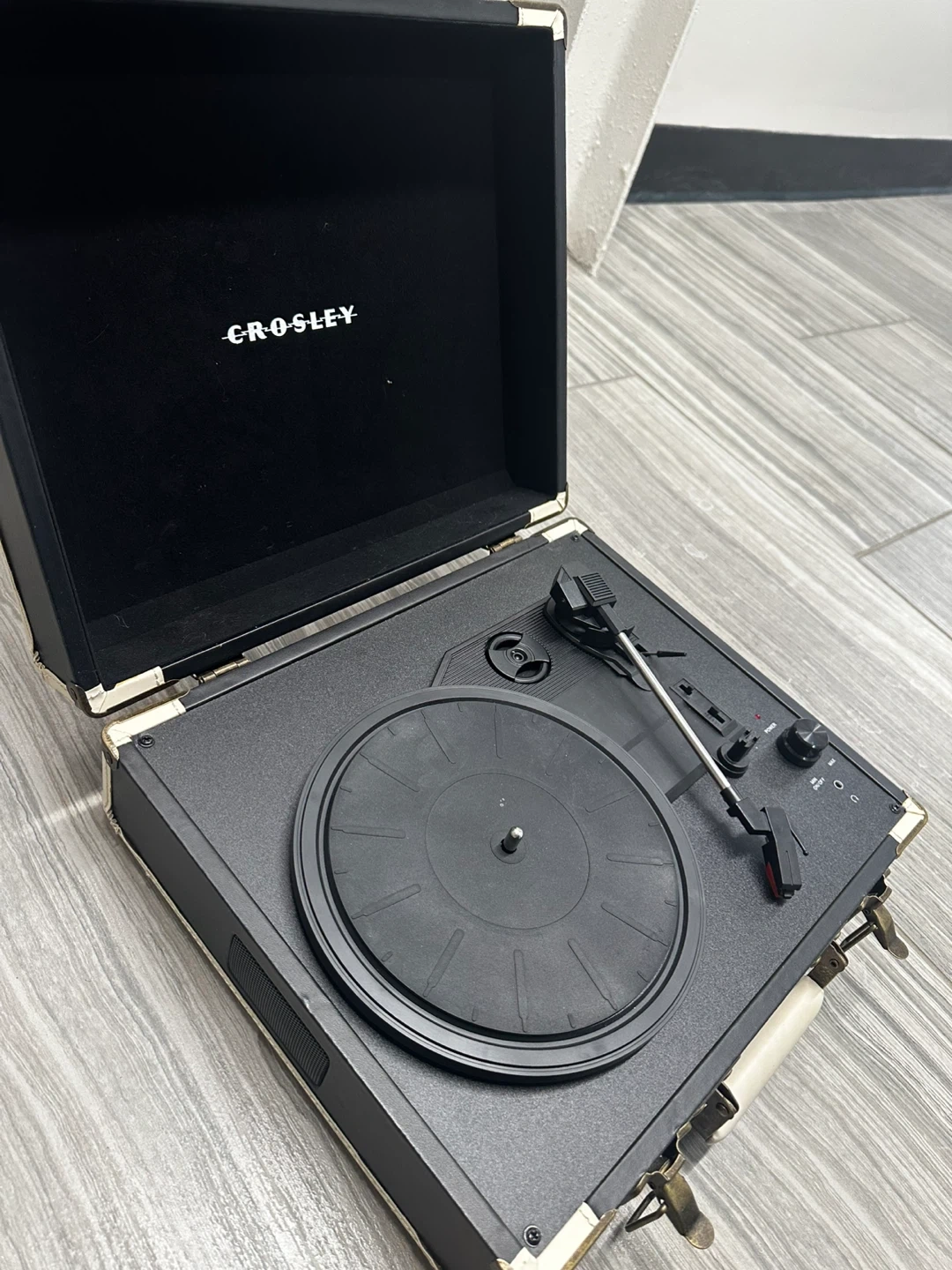 This is a Crosley record player with a black and cream vintage-style case. It's portable and looks like a suitcase when closed. It has a built-in speaker for easy listening.