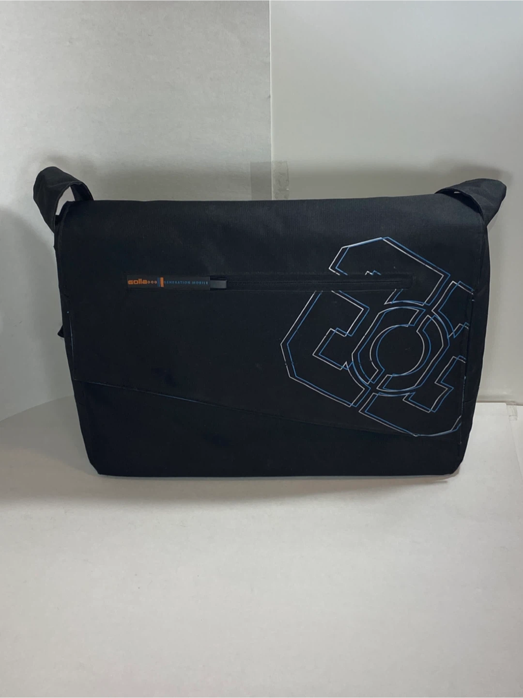 This black Gollla Generation Mobile messenger bag is designed for portable electronics. It features a main compartment and a zippered front pocket. The bag is designed to fit up to a 17.3" laptop.